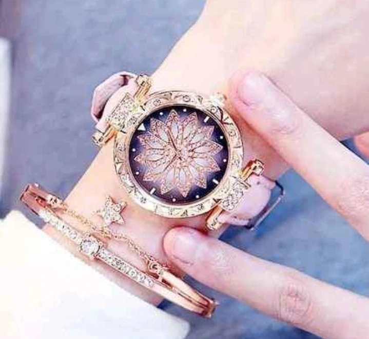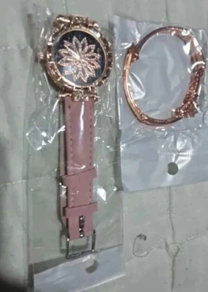 Brand new never used. Selling a cute rose gold watch and bracelet set! The watch has a round face with a glass dial window. The band is made of leather and has a buckle clasp. The dial diameter is 34. It's a fashionable and casual style! Pick-up Downtown Windsor. Please check out my other listing.