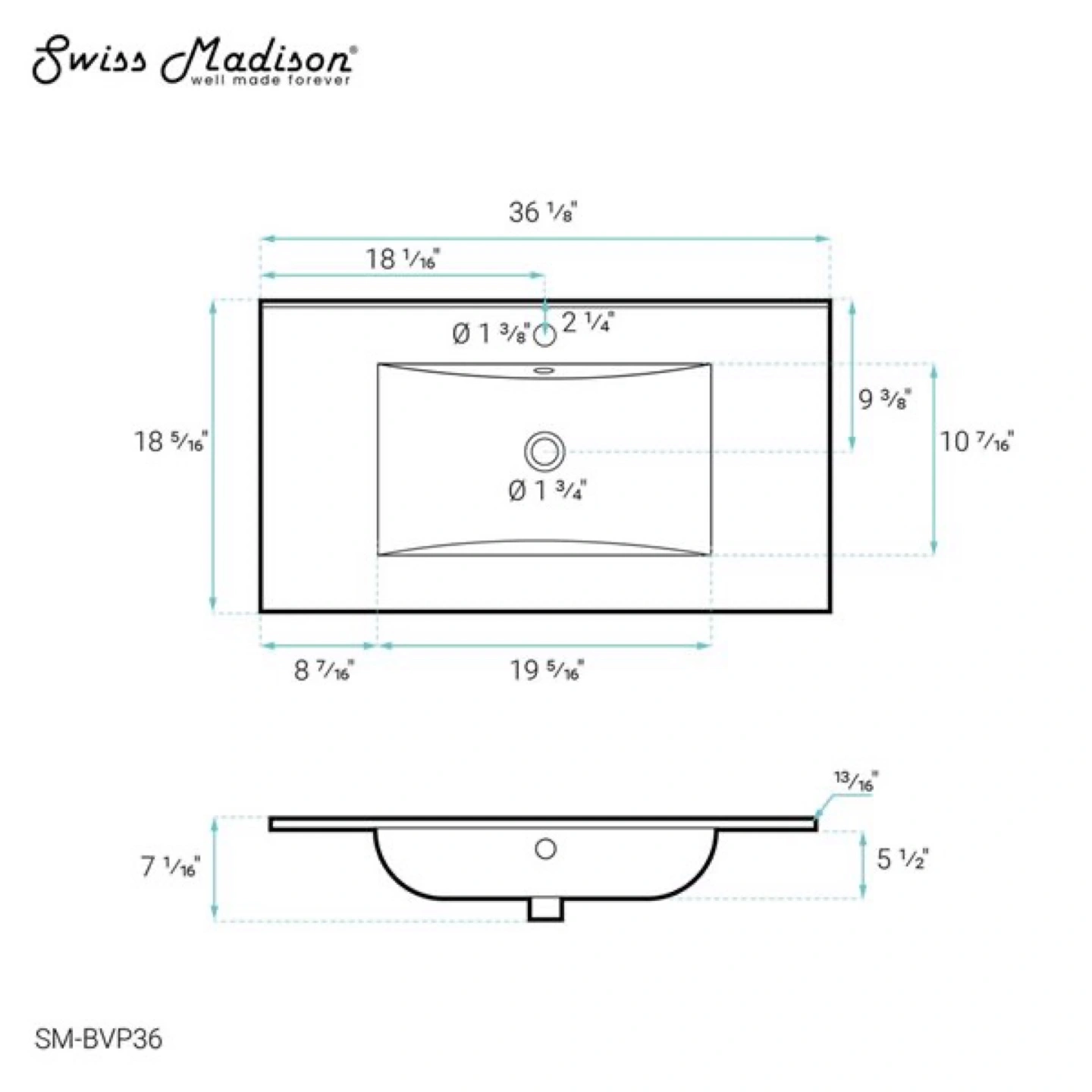 Selling a Swiss Madison vanity top. It measures 36 1/8 inches in length and 18 5/16 inches in width. The sink basin area is 19 5/16 inches by 10 7/16 inches. Great for a bathroom upgrade! Retail Price + Tax = 335.18 Meet/Pick-up Keele & Eglinton CASH ONLY 100.000.063
