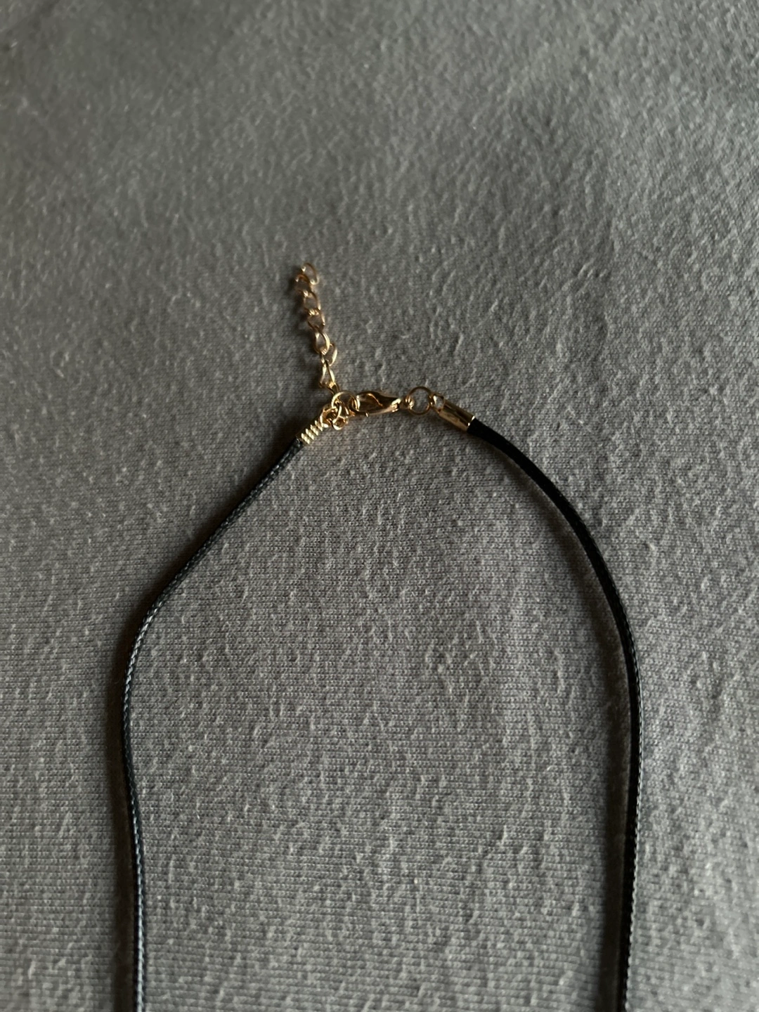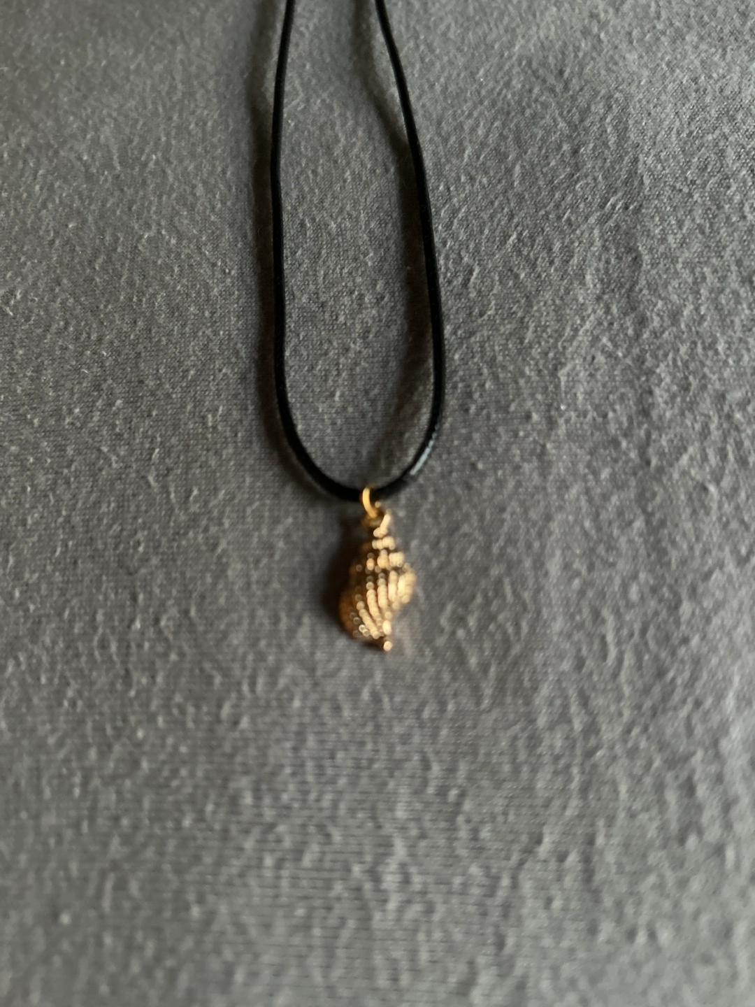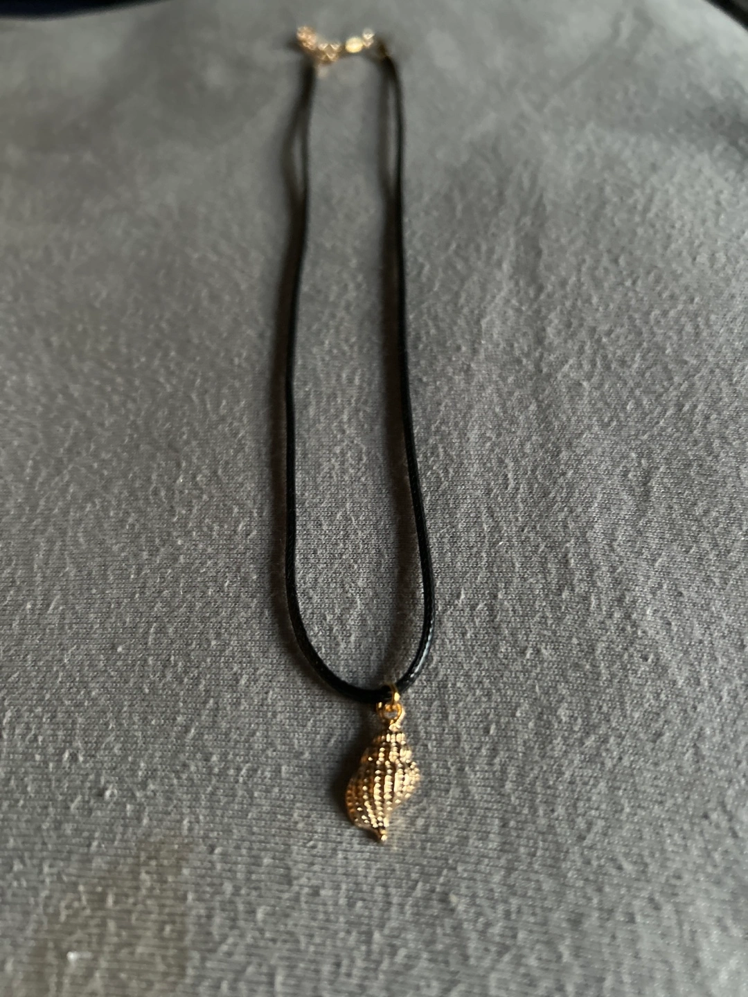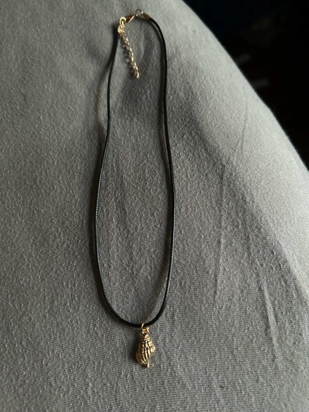 Selling a cute gold seashell pendant necklace. It has a black cord and gold clasp. Perfect for summer!
