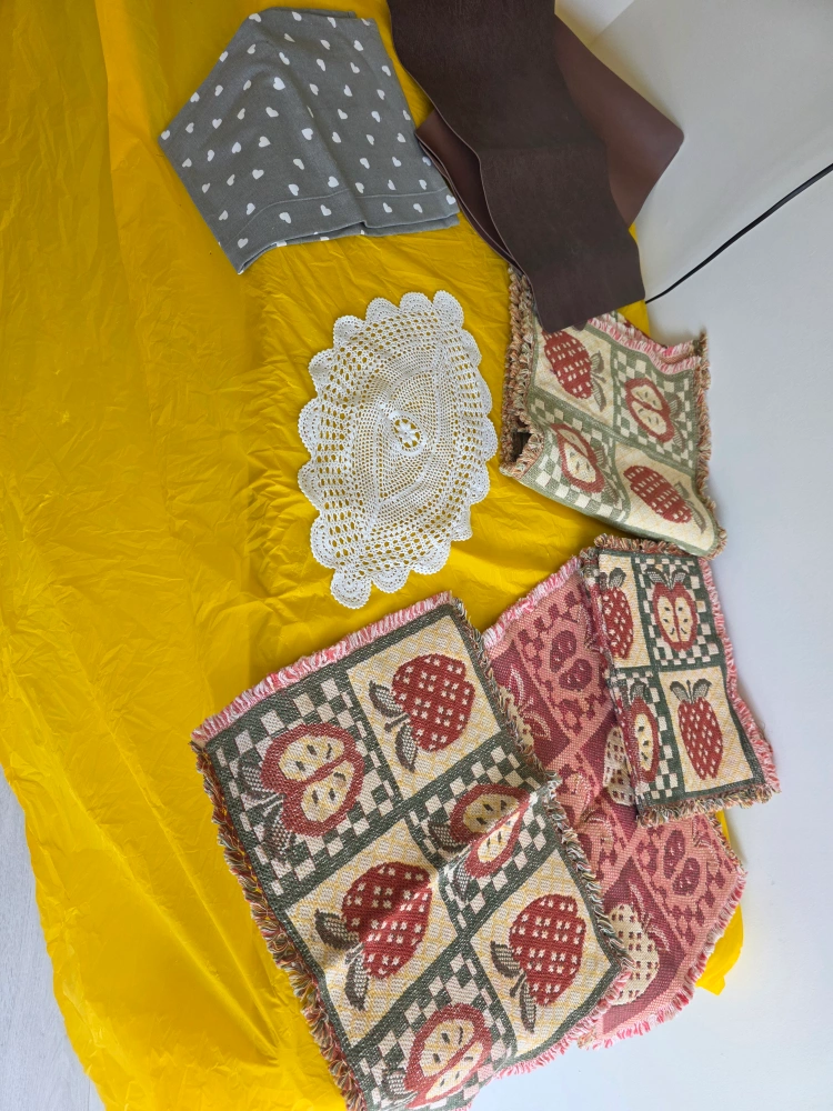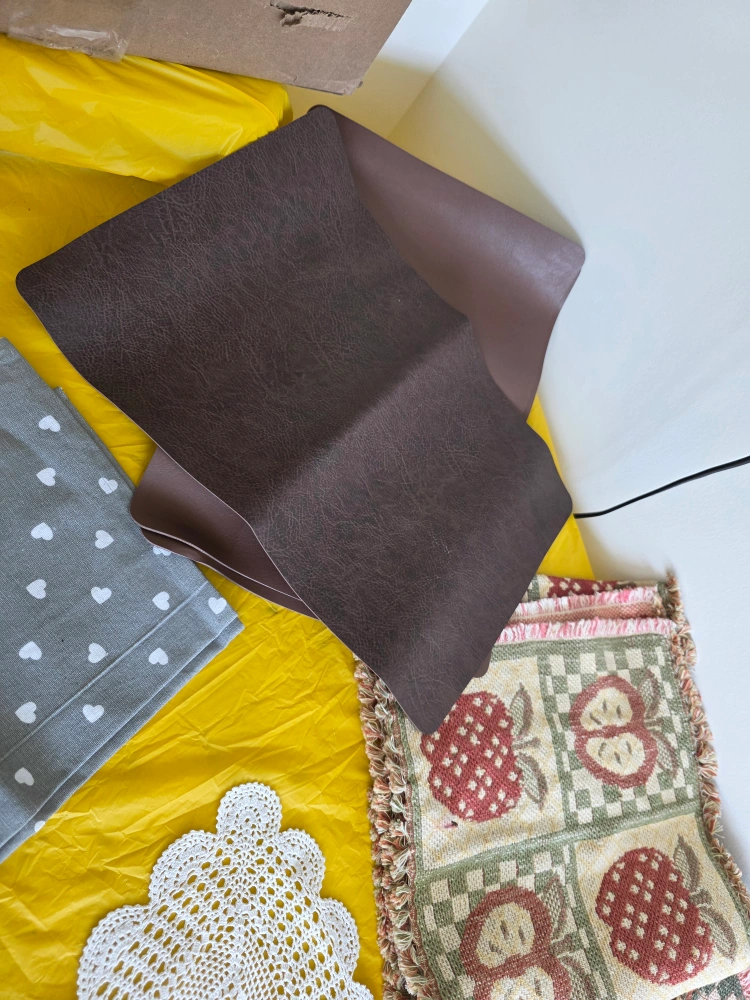 brown - faux leather reversible - ×3 - $8 apple reversible placematts - ×6 apple table runner - $10 for the set small linen heart hand towel / white table linen pickup in barrie / moving overseas great deals make me reasonable offers