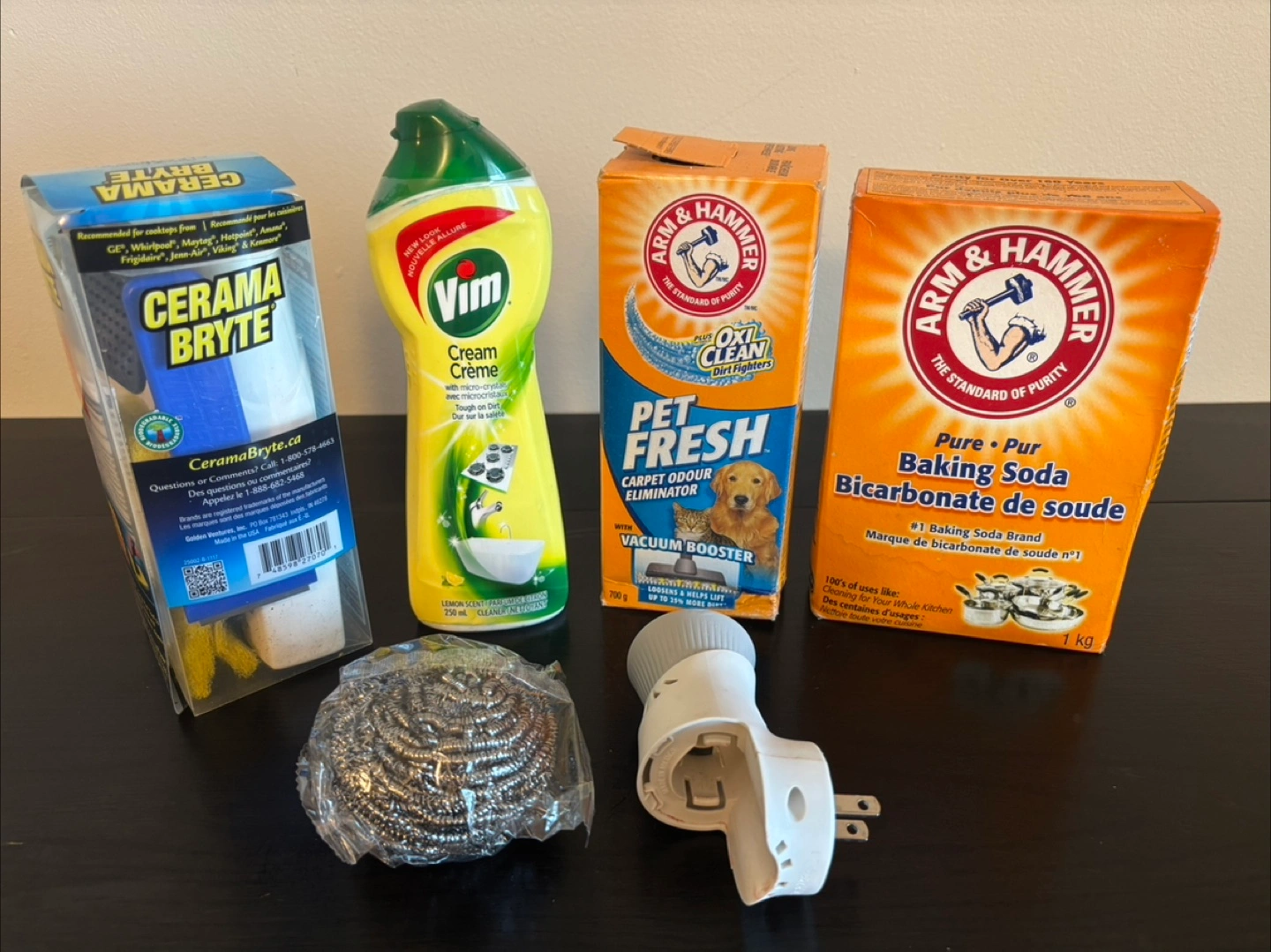 Selling a variety of cleaning supplies including: - Cerama Bryte cooktop cleaner (80% product left) - Vim Cream Crème lemon scented cleaner (250ml) (80% product left) - Arm & Hammer Pet Fresh carpet odour eliminator (700g) (40% product left) - Arm & Hammer Baking Soda (1kg) (40% product left)