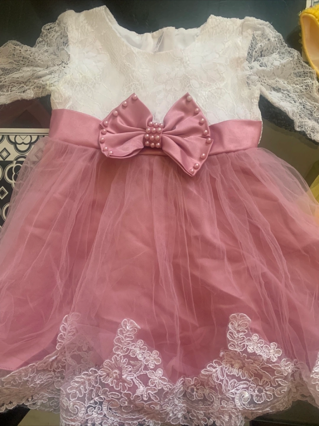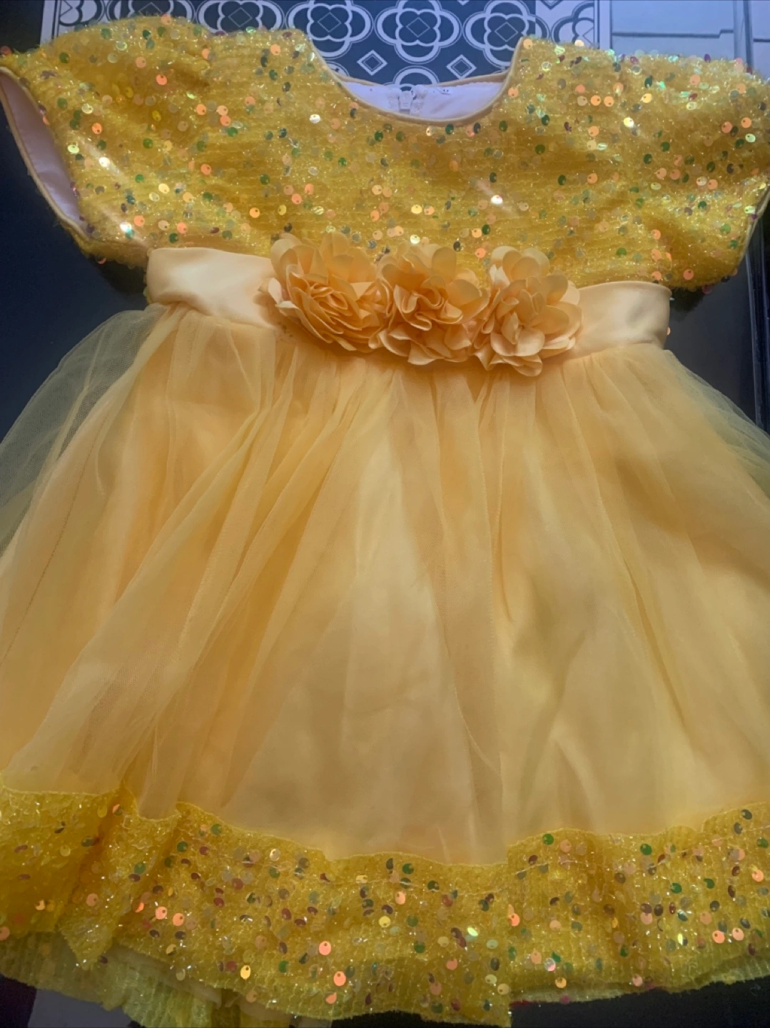 Two adorable party dresses for girls! One is a sunny yellow with sequins and flower details, and the other is a lovely pink with a lace bodice and pearl-accented bow. Perfect for special occasions! Fits one year old. $10 each