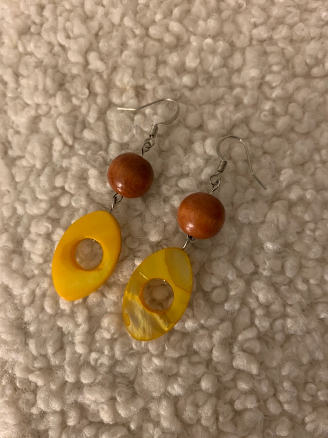 Cute dangle earrings featuring a wooden bead and a yellow oval with a hole in the middle. Pick up near Spadina Ave & Front St W