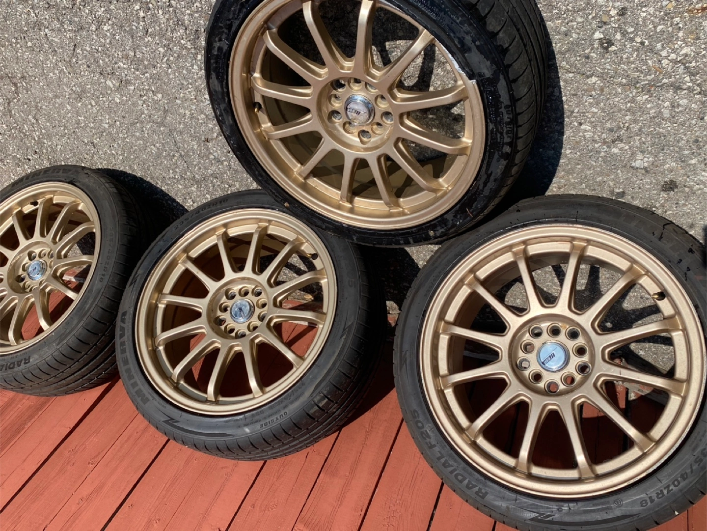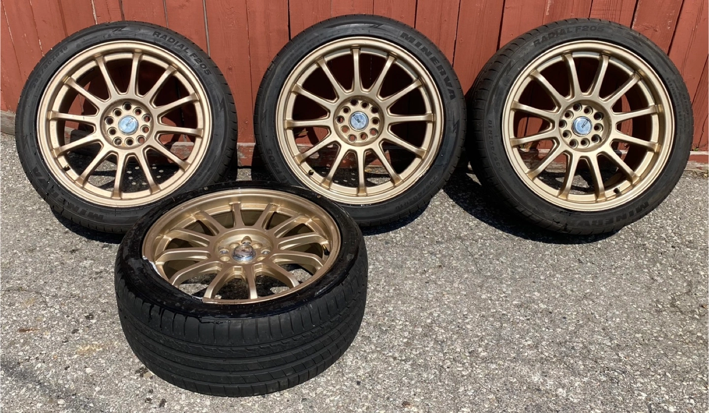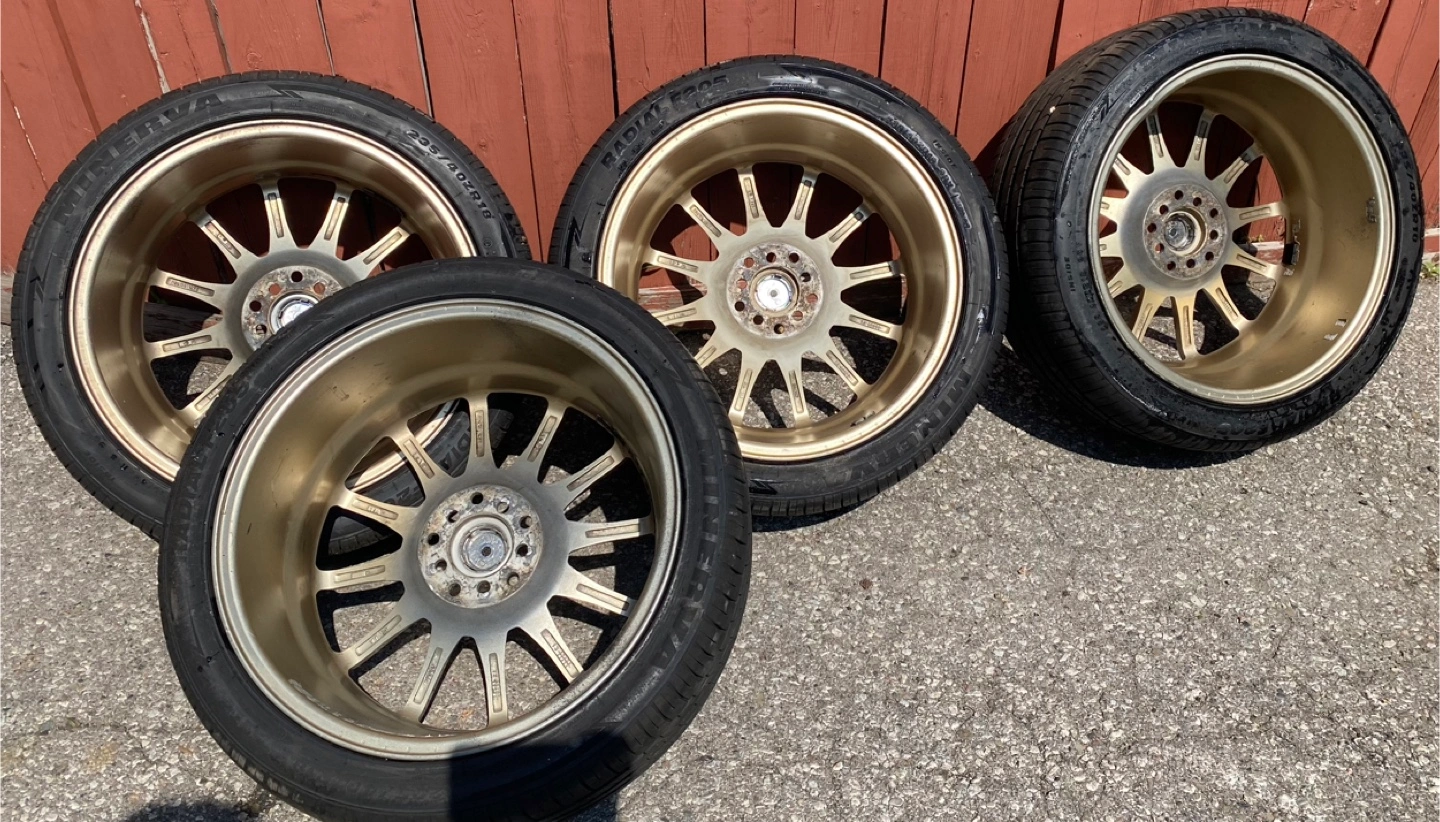 Selling a set of four gold rims, each with tires. The tire size is 235/40ZR18. The rim details are the last 2 pictures.