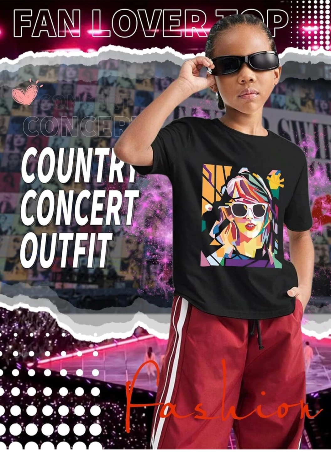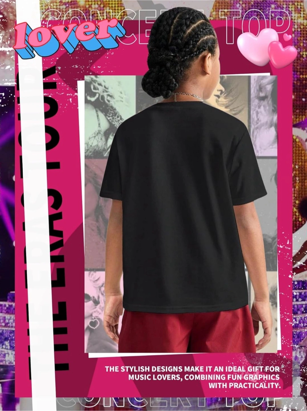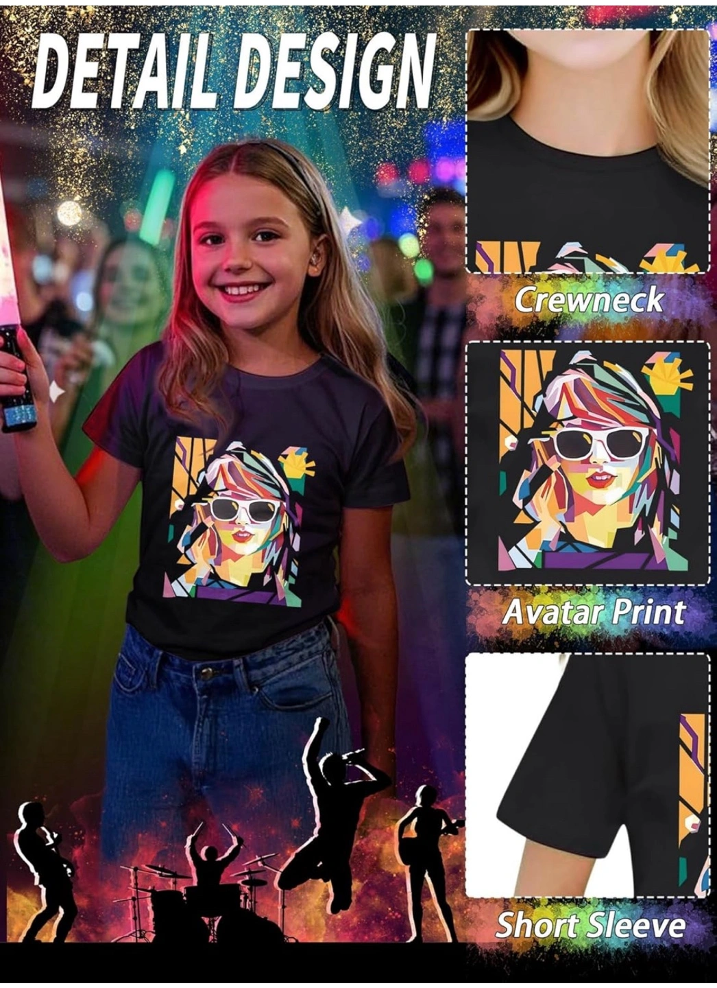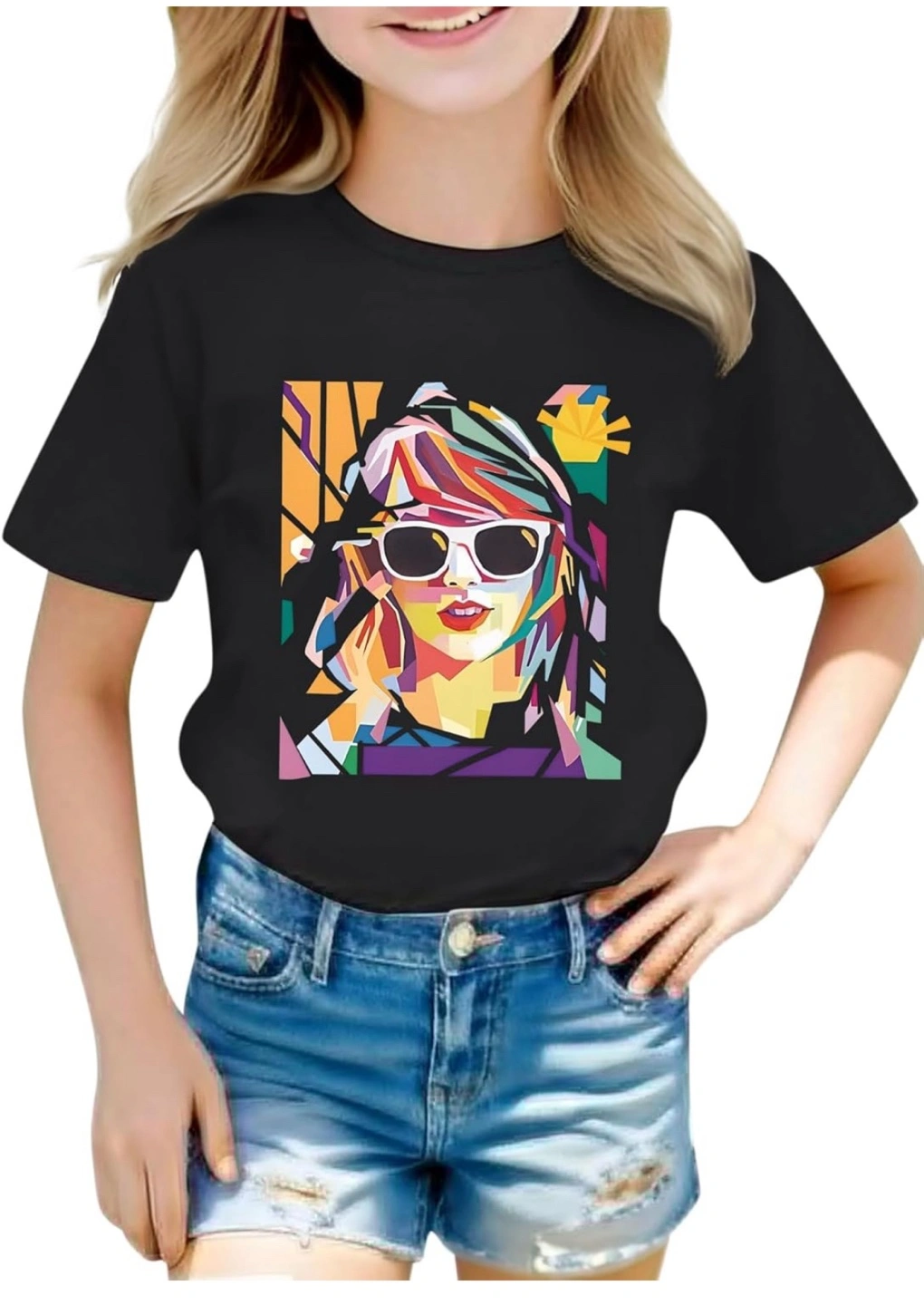 This black T-shirt & Shorts features a colourful avatar print of Taylor Swift, perfect for a concert outfit! It's made from breathable cotton material that's soft and skin-friendly, making it comfortable for active kids