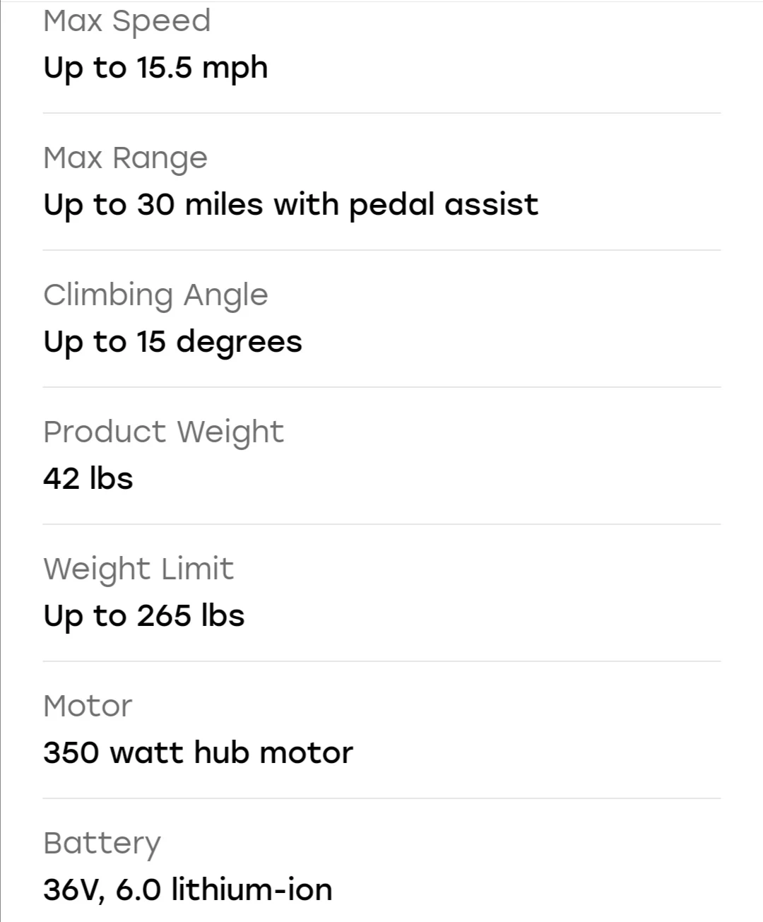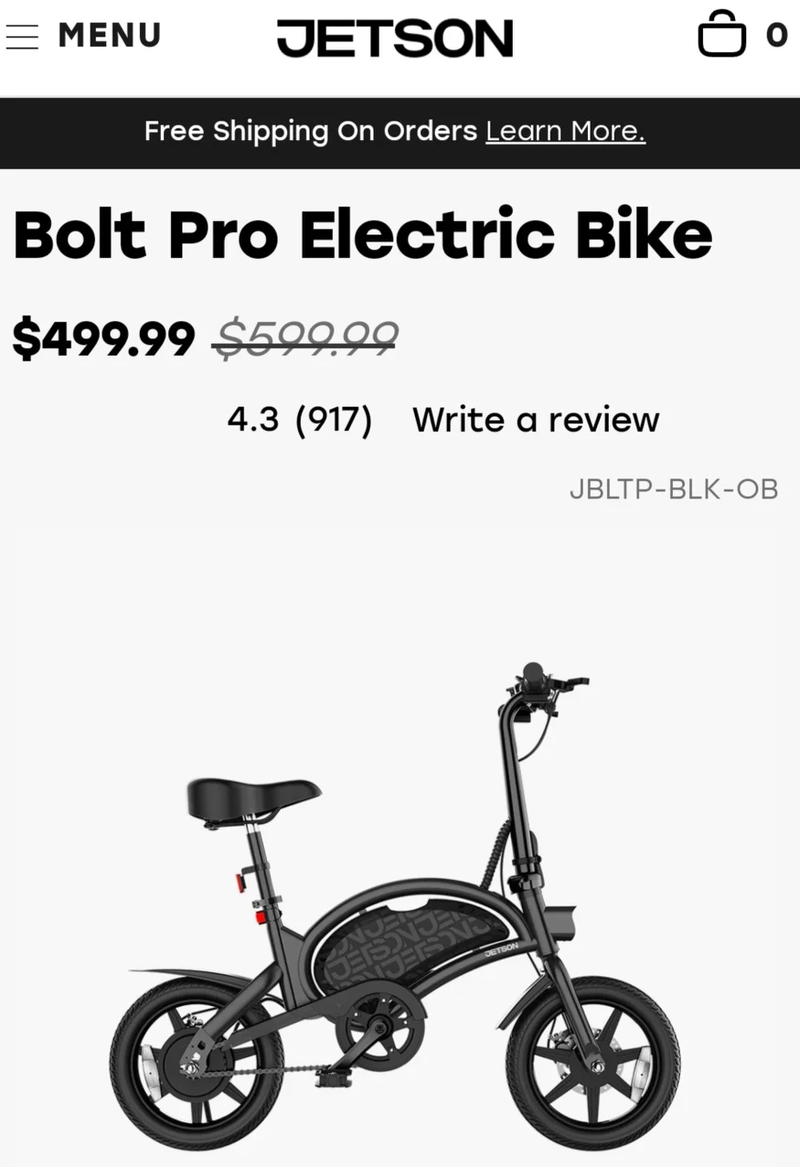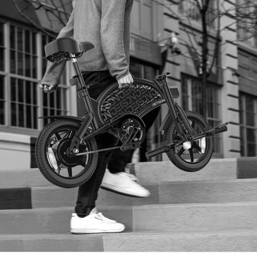 Jetson Electric Bike (Foldable) Get where you need to go (and have fun doing it) on the ultimate compact e-bike. Compact, lightweight, and easy to maneuver, the UL-listed Bolt Pro checks all the boxes for commuting and casual riding. But put practicality aside for just one sec: With its pep, polish, and amped-up 350-watt motor, riding the Bolt Pro also makes you feel alive. Go full-throttle, click on cruise control, or propel yourself with just the right amount of motor-backed pedal assistance — ride on your own terms, at speeds of up to 15.5 mph. You don’t need an agenda or a destination — but should you have one, collapse the handlebar, carry your Bolt Pro inside, and tuck it in a corner for recharging, so that it’s ready to cruise back home. Packaging included