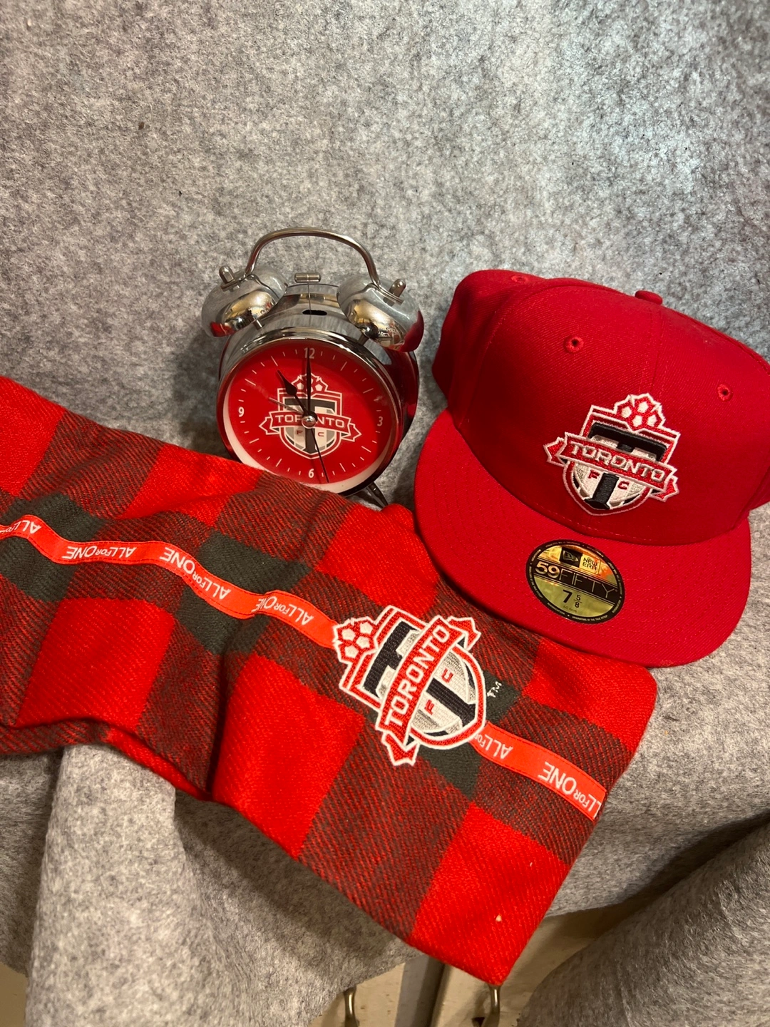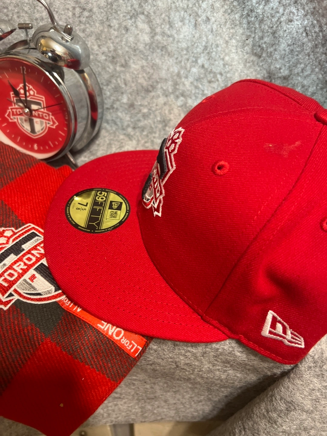 Selling a brand new New Era Toronto FC 59FIFTY hat! It's a vibrant red and in perfect condition. The size is 7 5/8. With scarf and alarm clock.
