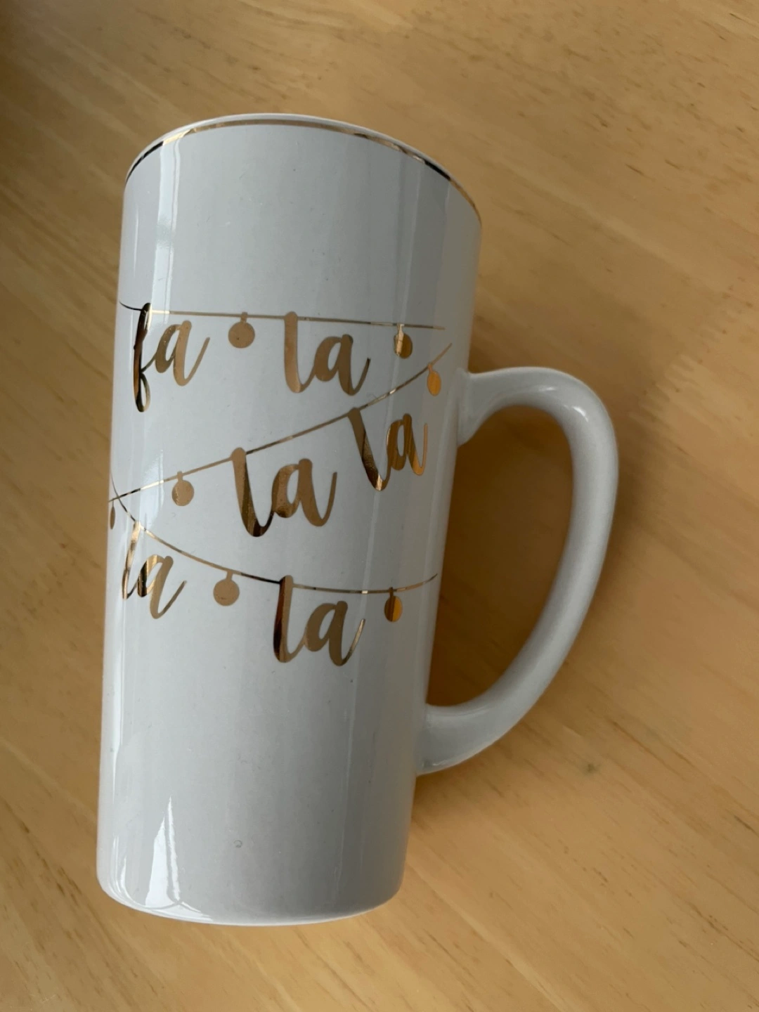 A cute white mug with a gold 'fa la la' design, perfect for the holidays or any time you want to feel festive! It's in great condition and ready to bring some cheer to your morning coffee or tea