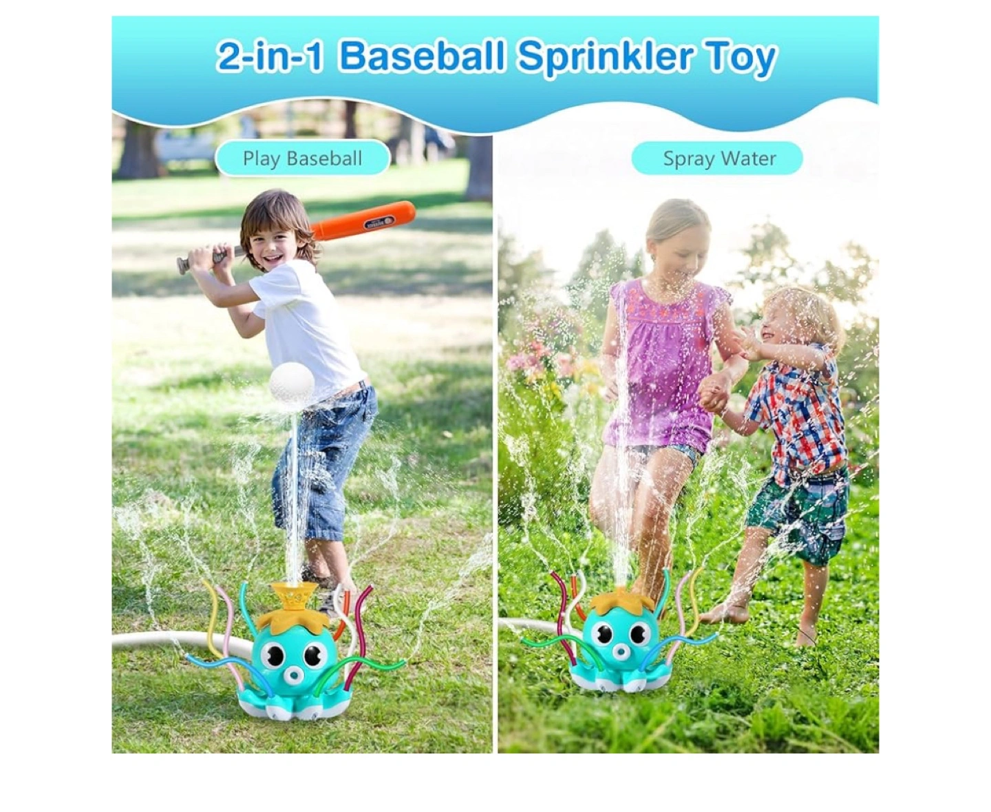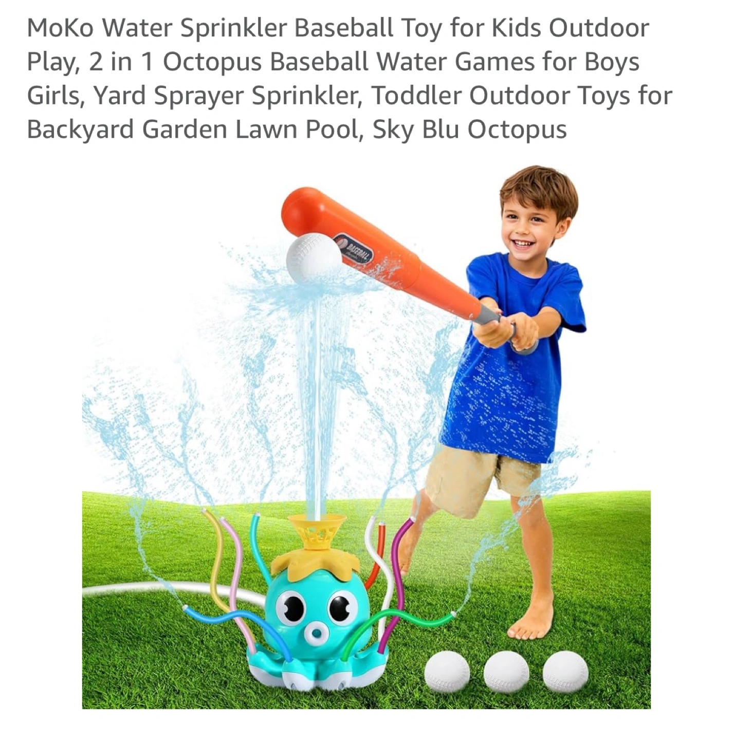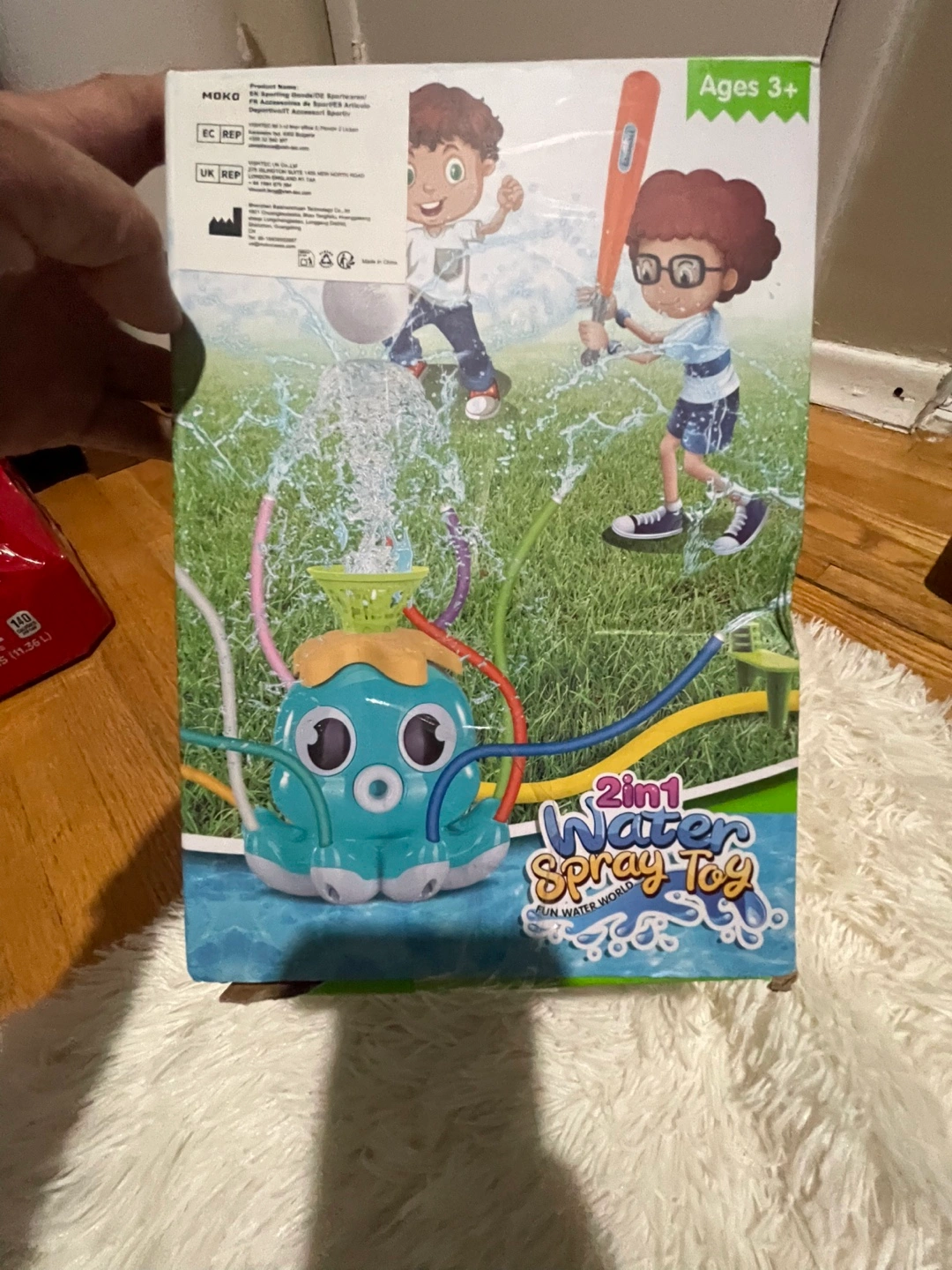 Looking for a fun way to keep the kids cool this summer? This Moko 2-in-1 water spray toy is perfect for kids ages 3 and up! It's a water sprinkler and baseball game all in one. Comes with the box and all components!