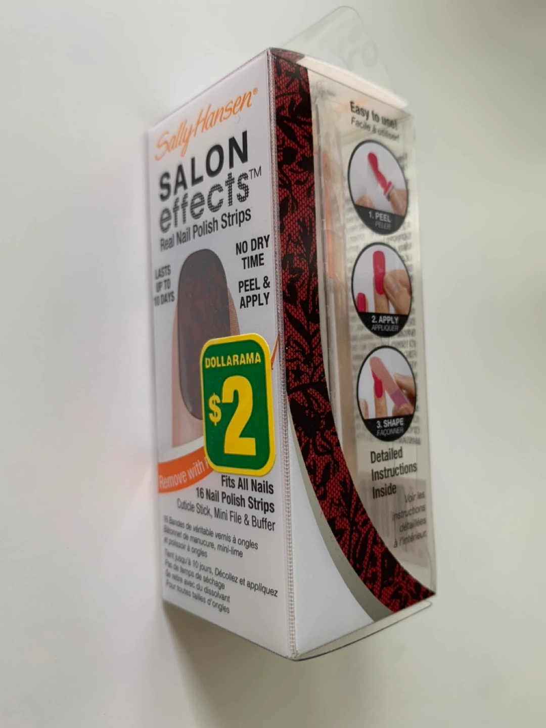 Sally Hansen Salon Effects Real Nail Polish Strips for easy application. Fits all nails and includes 16 nail polish strips, a cuticle stick, mini file, and buffer. No dry time needed - just peel and apply! Pick up near Spadina Ave & Front St W