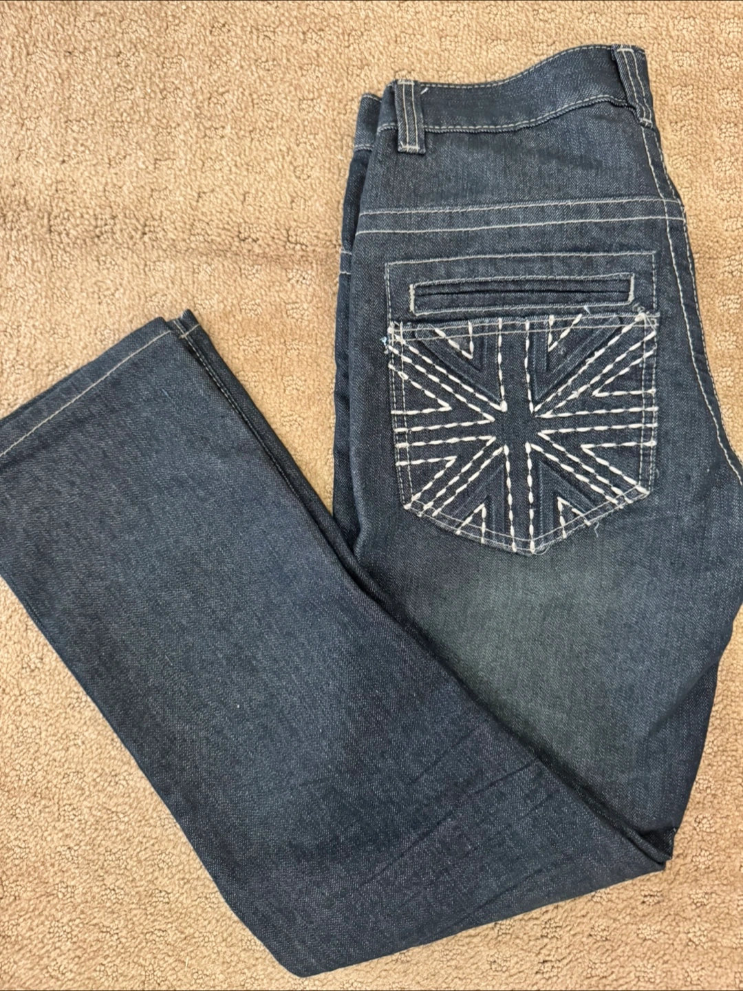 Selling a new pair of Lions Crest by English Laundry jeans in size 30/30. These jeans have a straight fit and feature a unique Union Jack design on the back pockets!