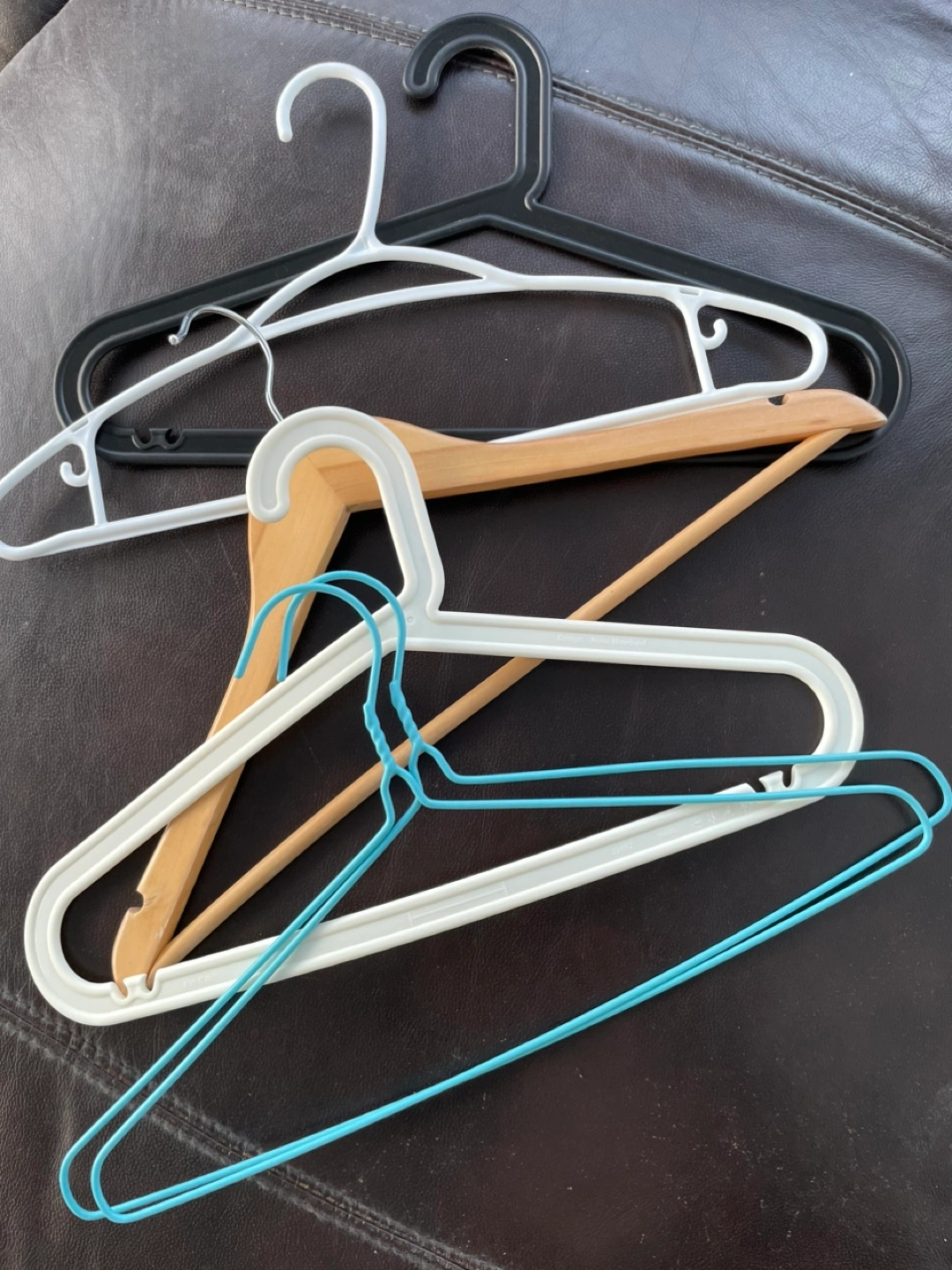 6 clothes hangers up for grabs! There's a mix of colours and materials, including plastic, wood, and metal. Perfect for organizing your closet or adding extra hanging space