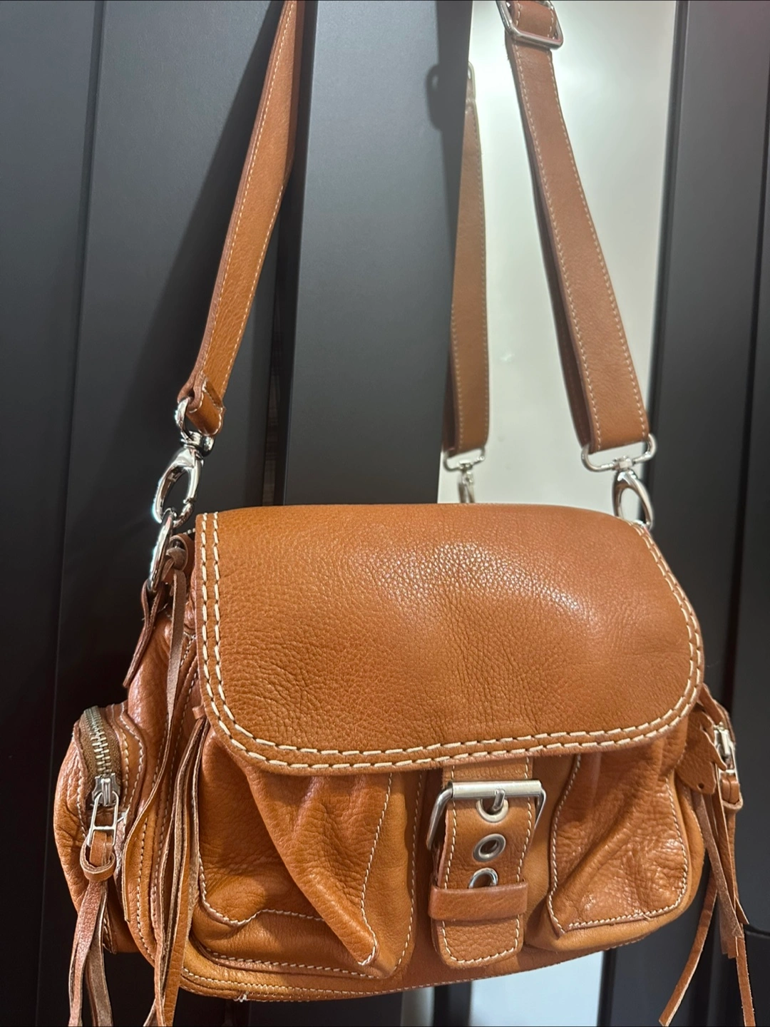 Selling a Roots crossbody bag in brown leather. It's a stylish and functional bag with a unique design. Perfect for everyday use!