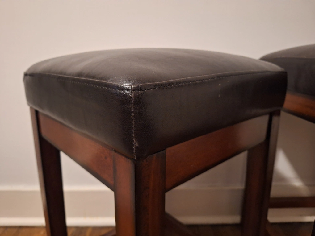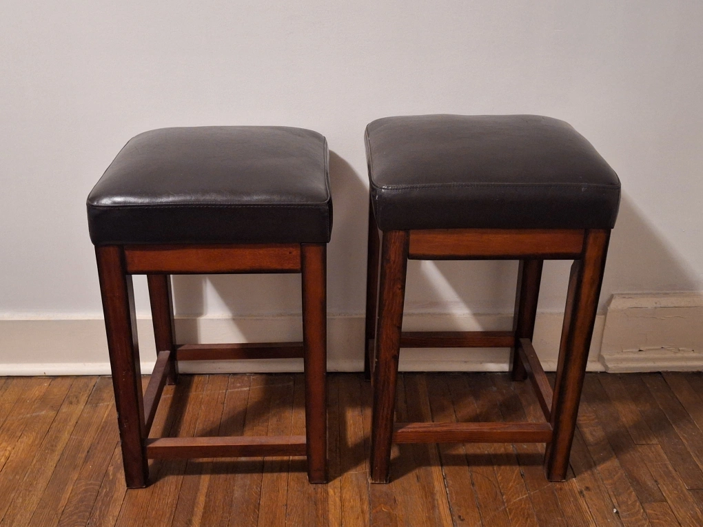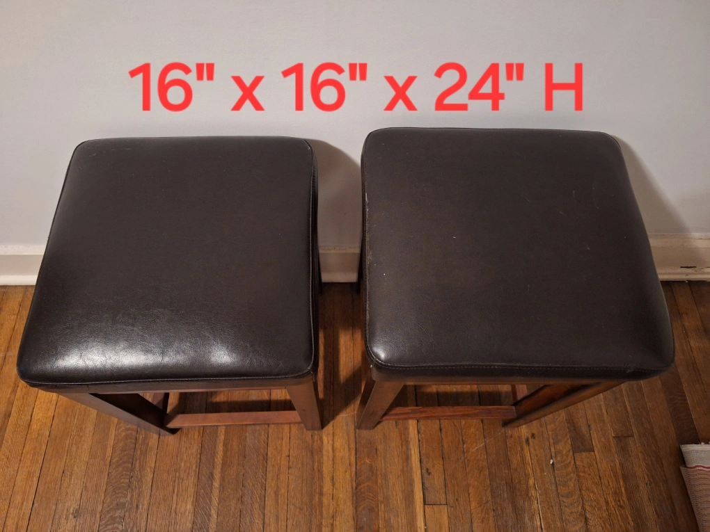 Comfortable bar tools featuring brown leather seat cushions. Square design, with dark brown wooden legs. Seat 16" x 16" Height 24" $30 for both. Must pick up near St Clair West subway station.