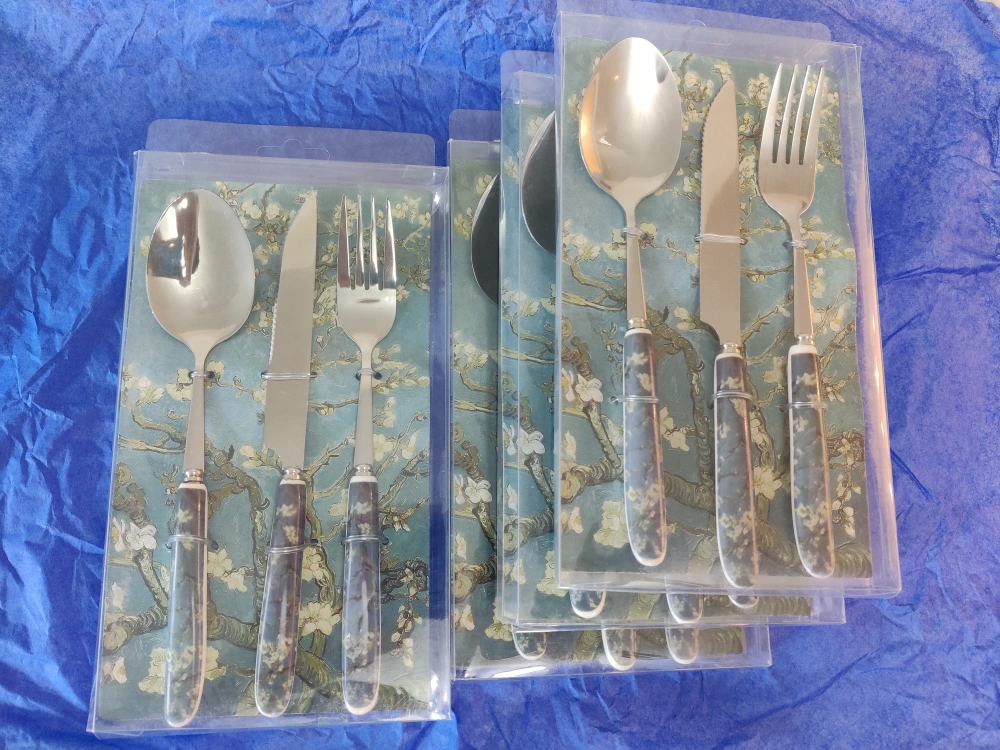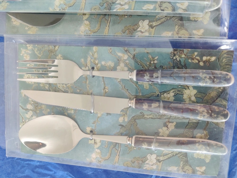 I'm selling a brand new cutlery set featuring Van Gogh's Almond Blossom print. It comes with a spoon, fork, and knife, all still in their original packaging. Originally bought for $24.99, now $12 per set, 2 sets available From a no pet non smoking home Meetup near Finch and Yonge Cash only Please check other listings on my profile :)