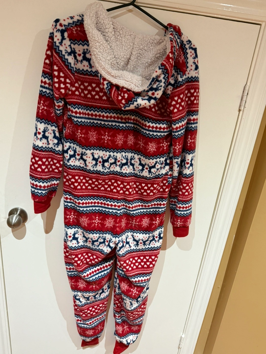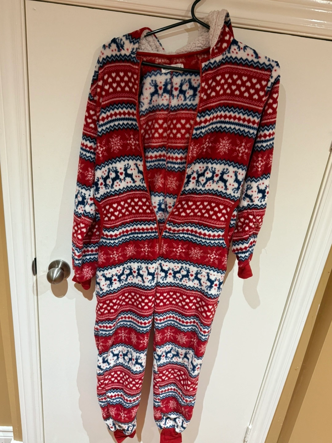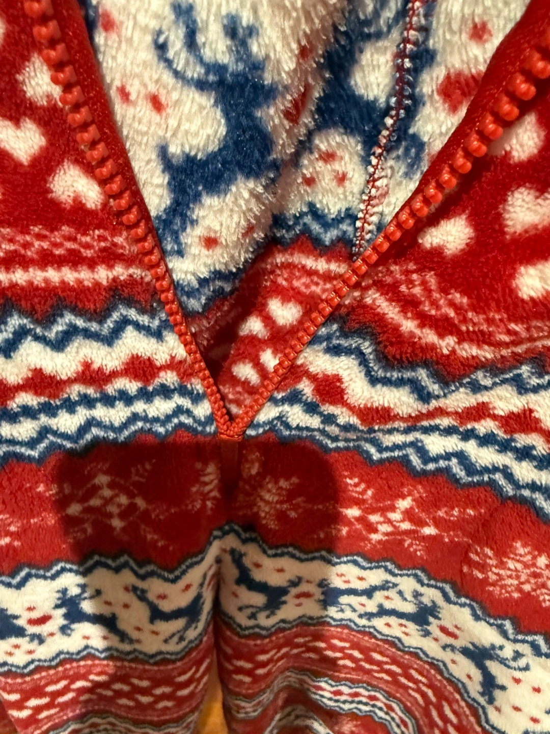 Snuggle up in this adorable Weekend Edition onesie! It features a festive red, white, and blue pattern with reindeer and snowflake designs. Perfect for cozy nights in! (Repairing needed zip )