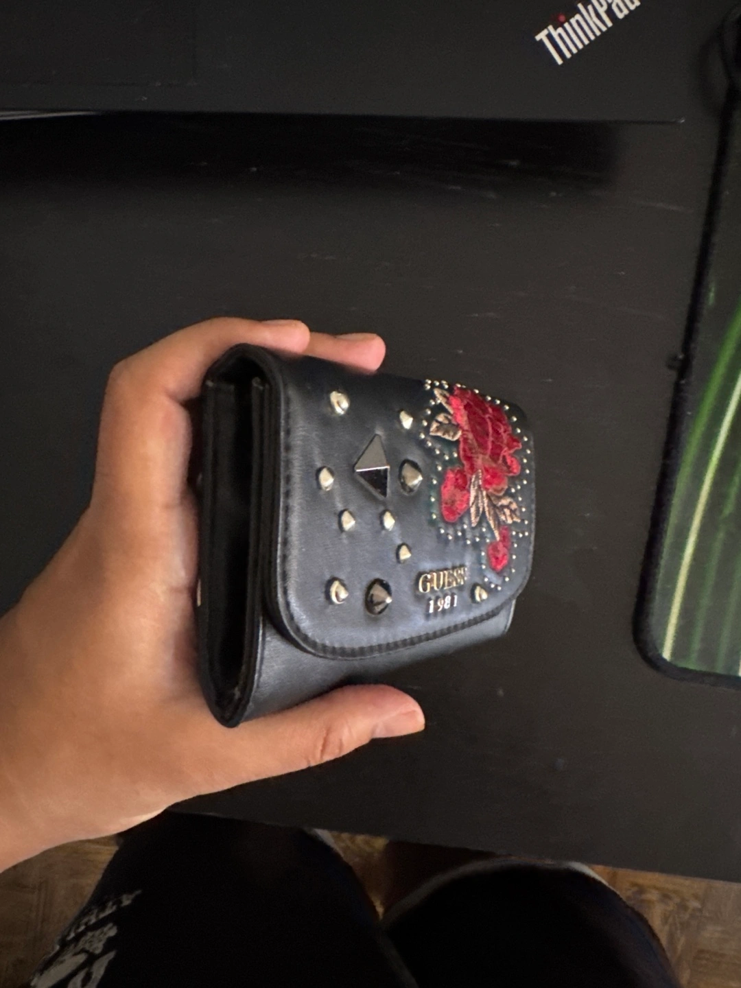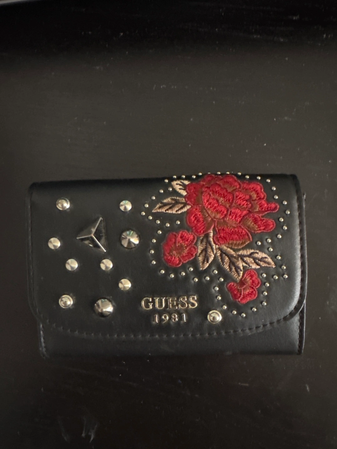 Selling a cute Guess 1981 wallet! It's black with a beautiful red floral design and studded accents. It's a stylish little wallet perfect for everyday use, 120 OBO