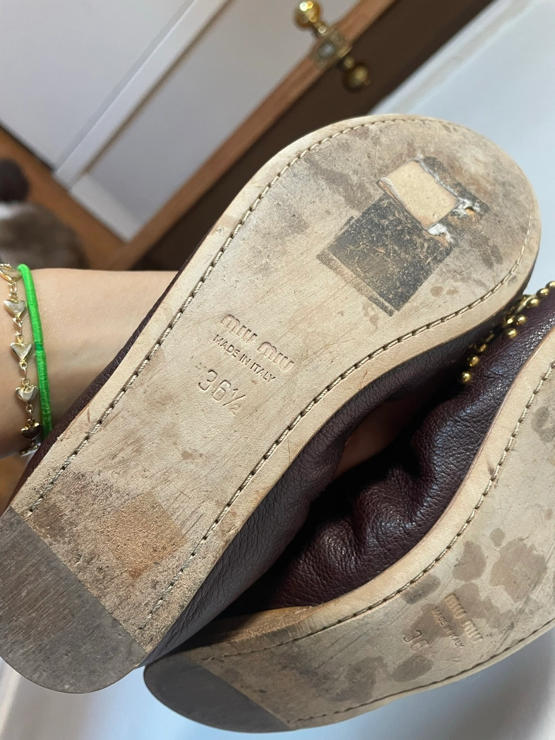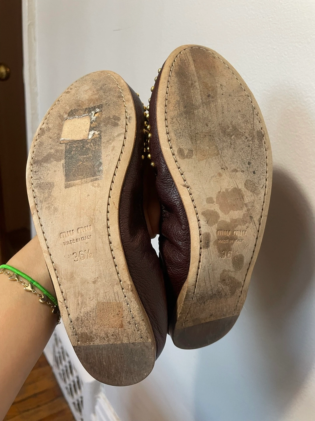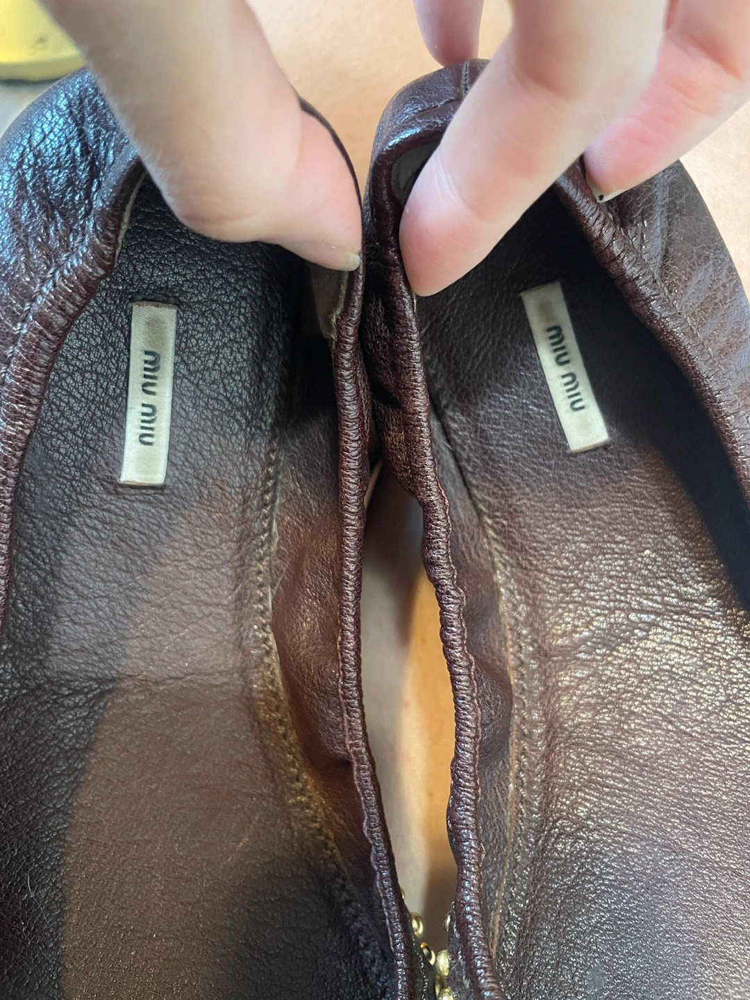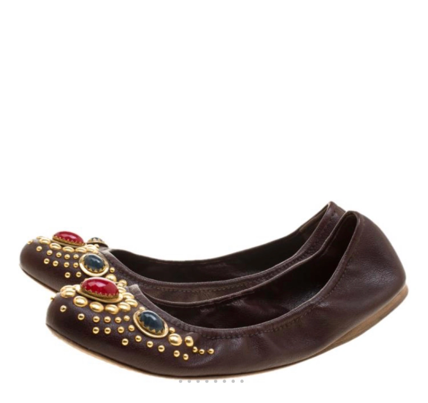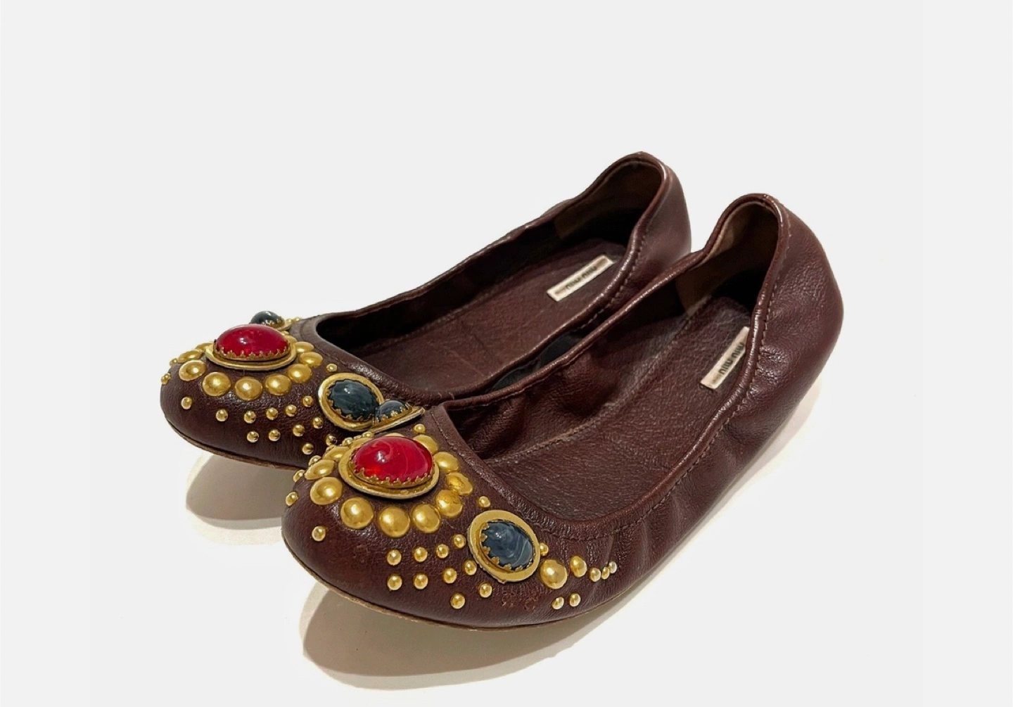 These Miu Miu ballet flats are a stylish addition to any wardrobe! They feature a unique embellished design with gold studs and colourful gems on the toe. The leather is a rich, dark brown. They're in great condition and ready for a new home! If the ad is still on is AVAILABLE Pick up at Dufferin and st Clair See my other listings for a bundle pricing if interested in another item :) Cash only Purchases of $50 or more get a free GIFT - Items can be only put on hold with a deposit, otherwise first come first serve basis. If you are interested to try on something let me know and we can arrange a time. Delivery $6.50 only available within 7km from dufferin and st Clair