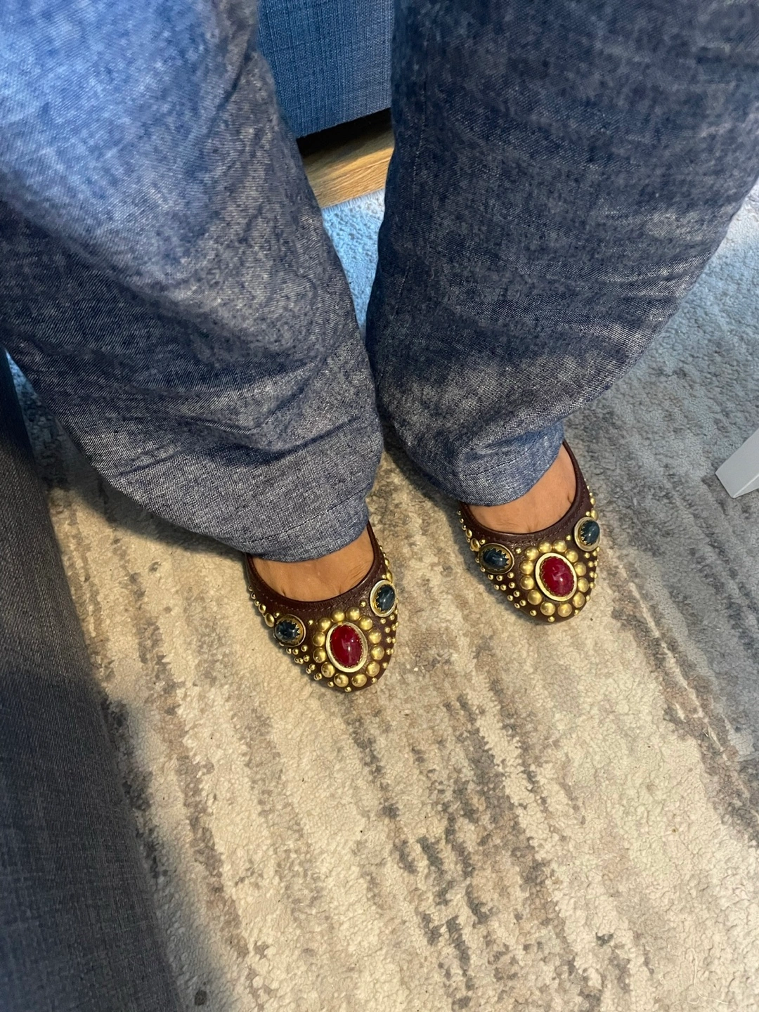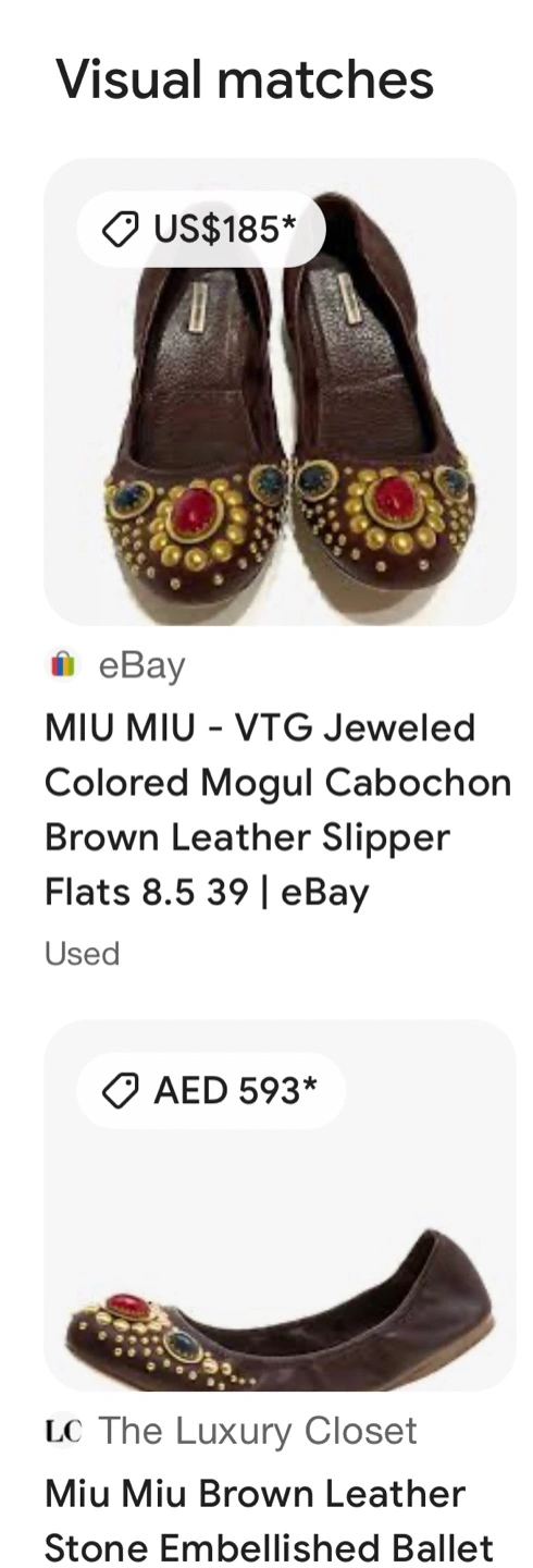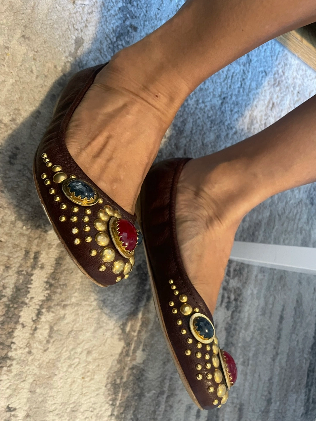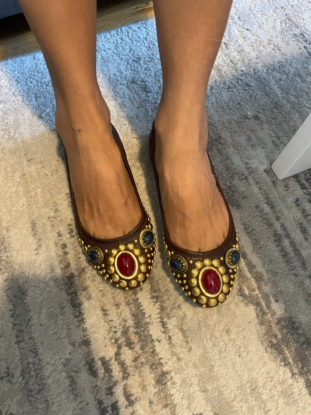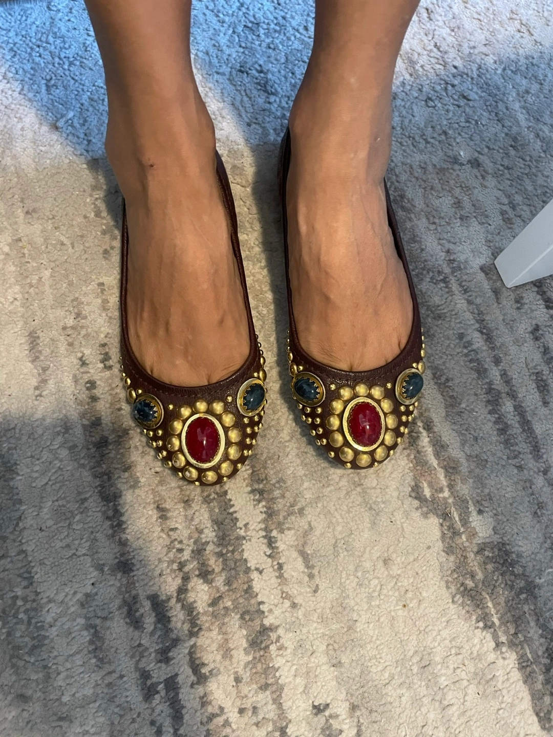These Miu Miu ballet flats are a stylish addition to any wardrobe! They feature a unique embellished design with gold studs and colourful gems on the toe. The leather is a rich, dark brown. They're in great condition and ready for a new home! If the ad is still on is AVAILABLE Pick up at Dufferin and st Clair See my other listings for a bundle pricing if interested in another item :) Cash only Purchases of $50 or more get a free GIFT - Items can be only put on hold with a deposit, otherwise first come first serve basis. If you are interested to try on something let me know and we can arrange a time. Delivery $6.50 only available within 7km from dufferin and st Clair