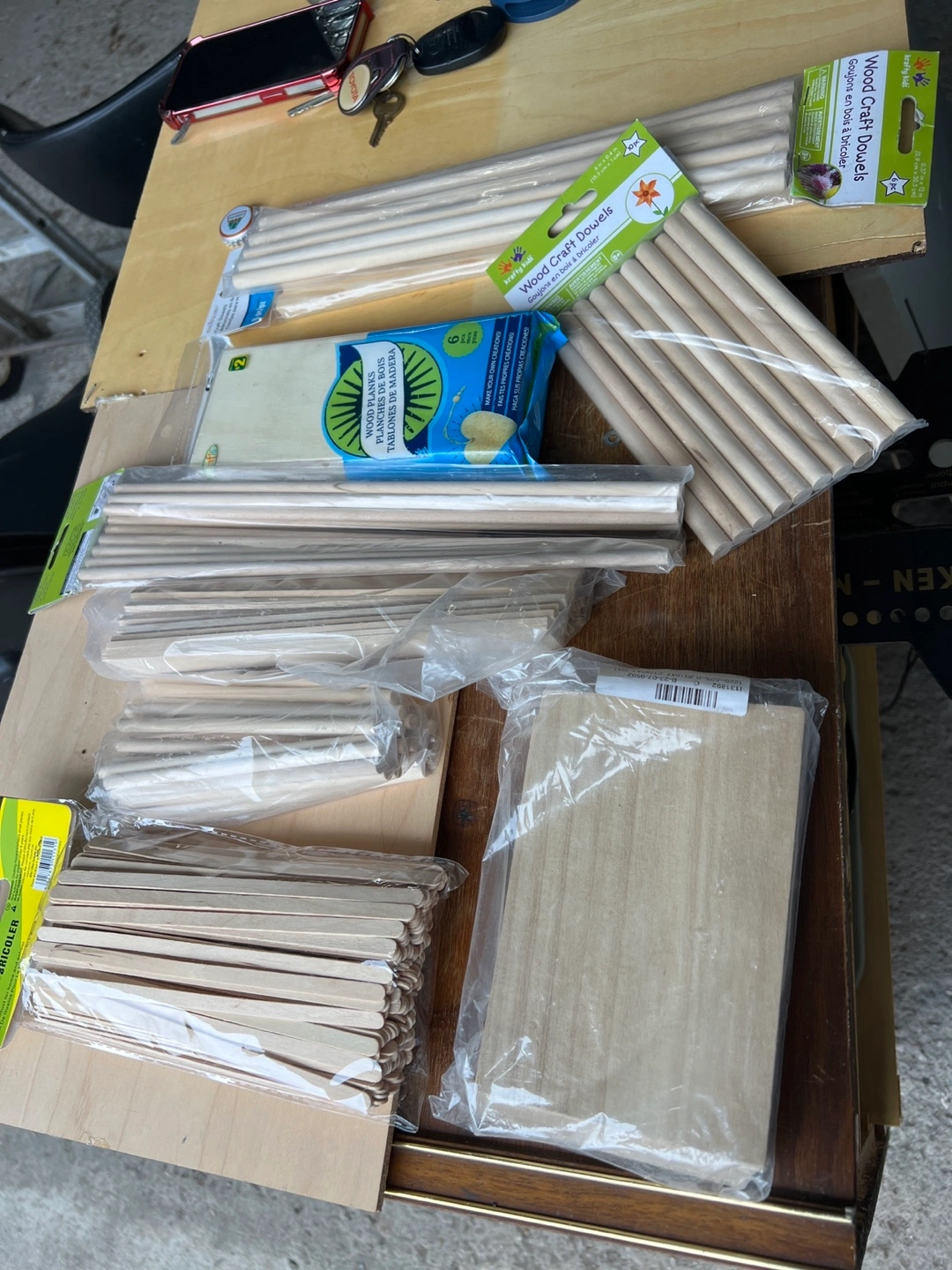 Selling a variety of craft supplies from Krafty Kids! Included are wood craft dowels and wood planks, perfect for your DIY creations. Get everything you need for your next project in one go