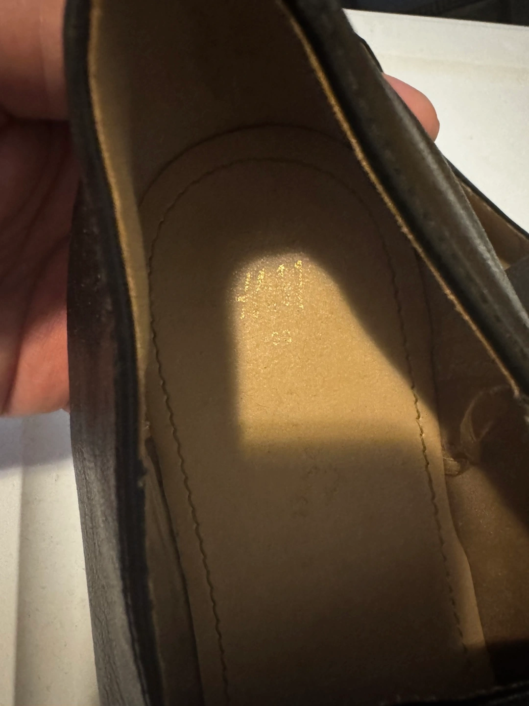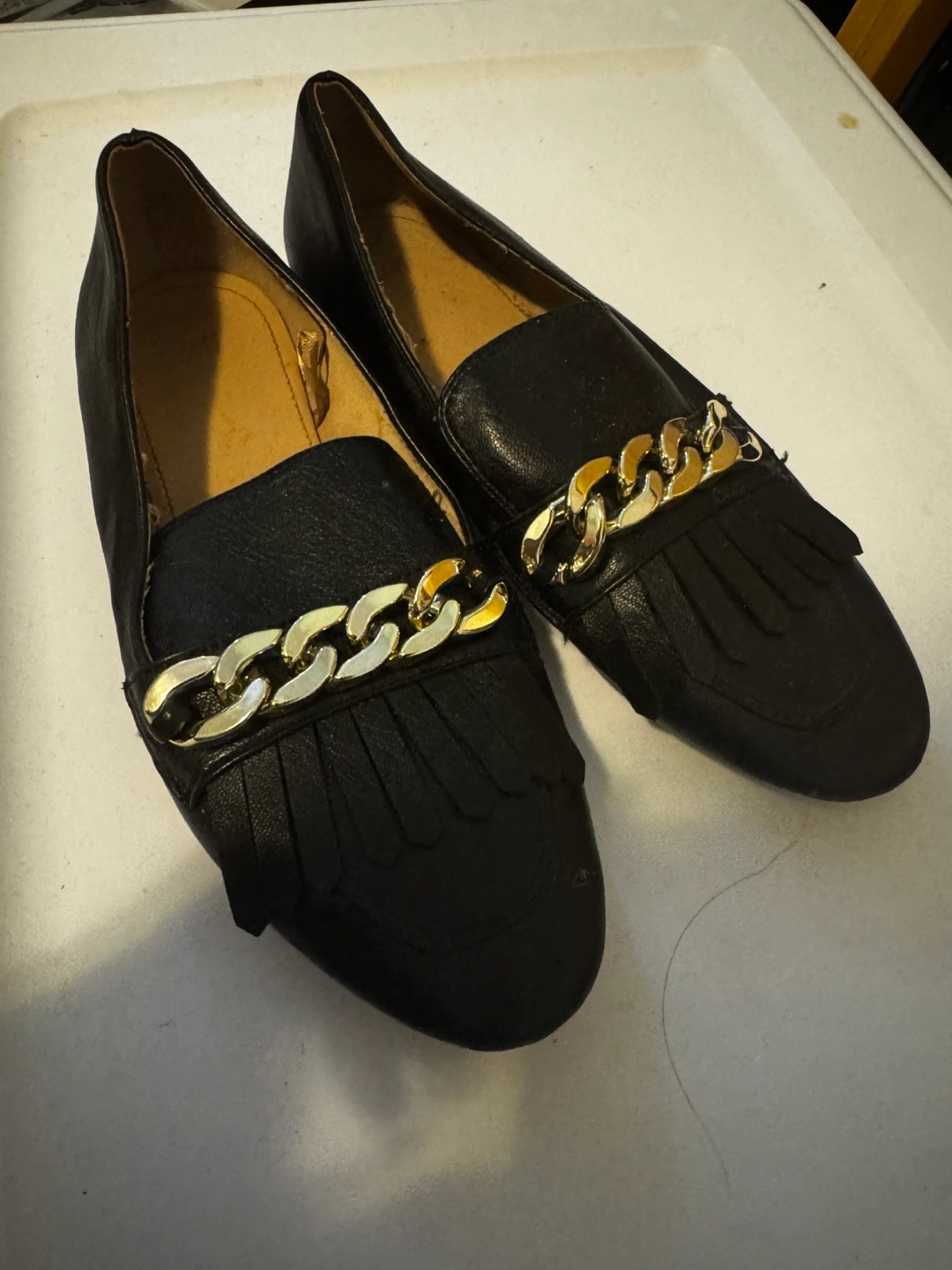 These are a pair of black loafers from H&M. They have a gold chain detail across the front. They are a size 7 and in good condition!