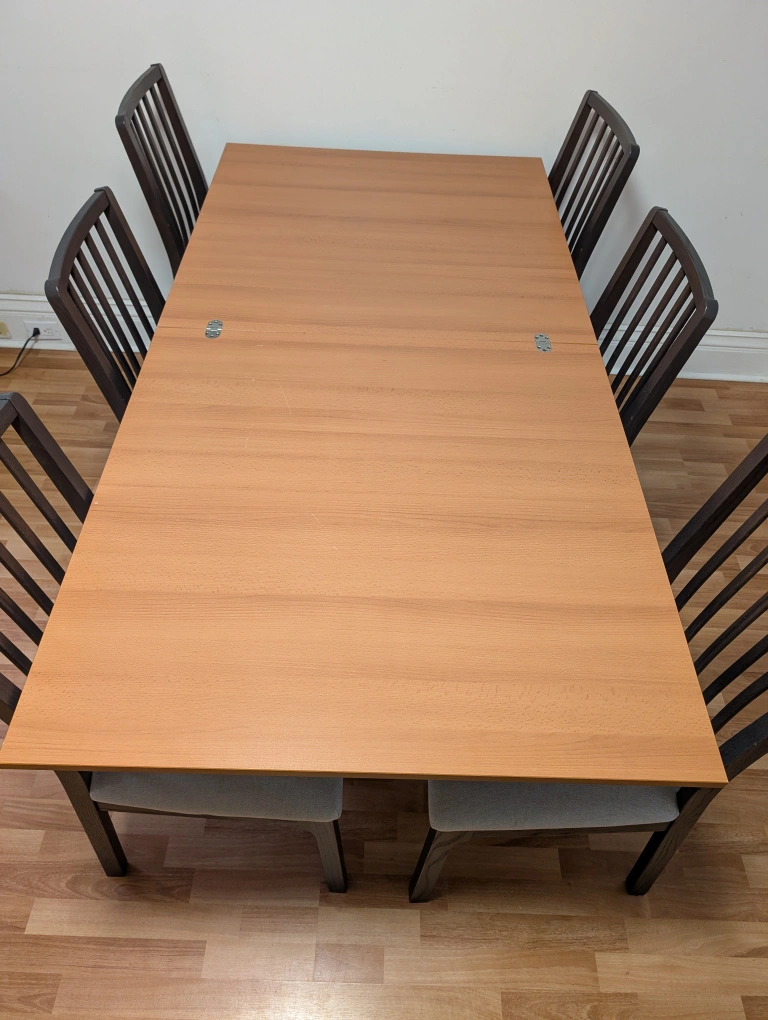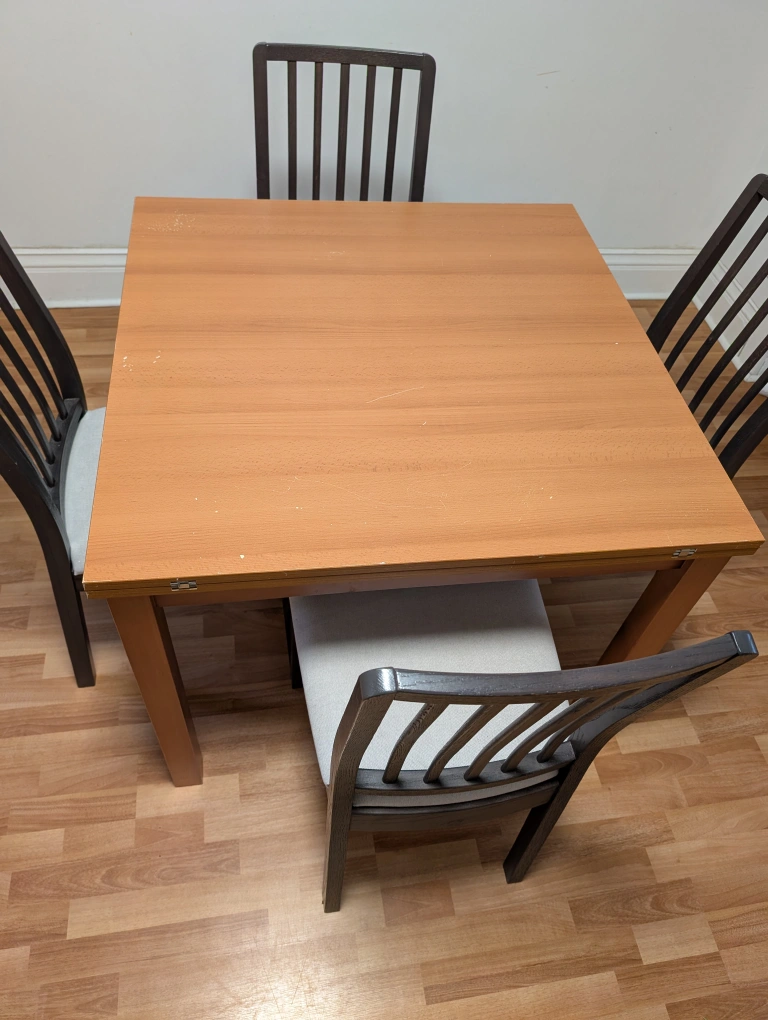 Wooden table, can seat 4 when square and extends to seat 6. Some scratches on square top. Dimensions : 35.5in x 35.5in x 29.75in extends to 35.5in x 71in x 29in 90cm x 90cm x 75.8cm extends to 90cm x 180cm x 73.8cm
