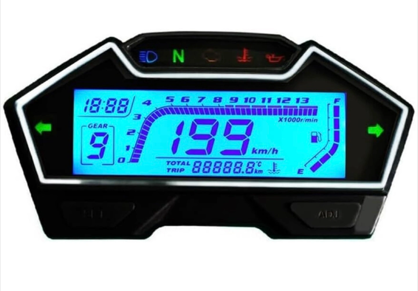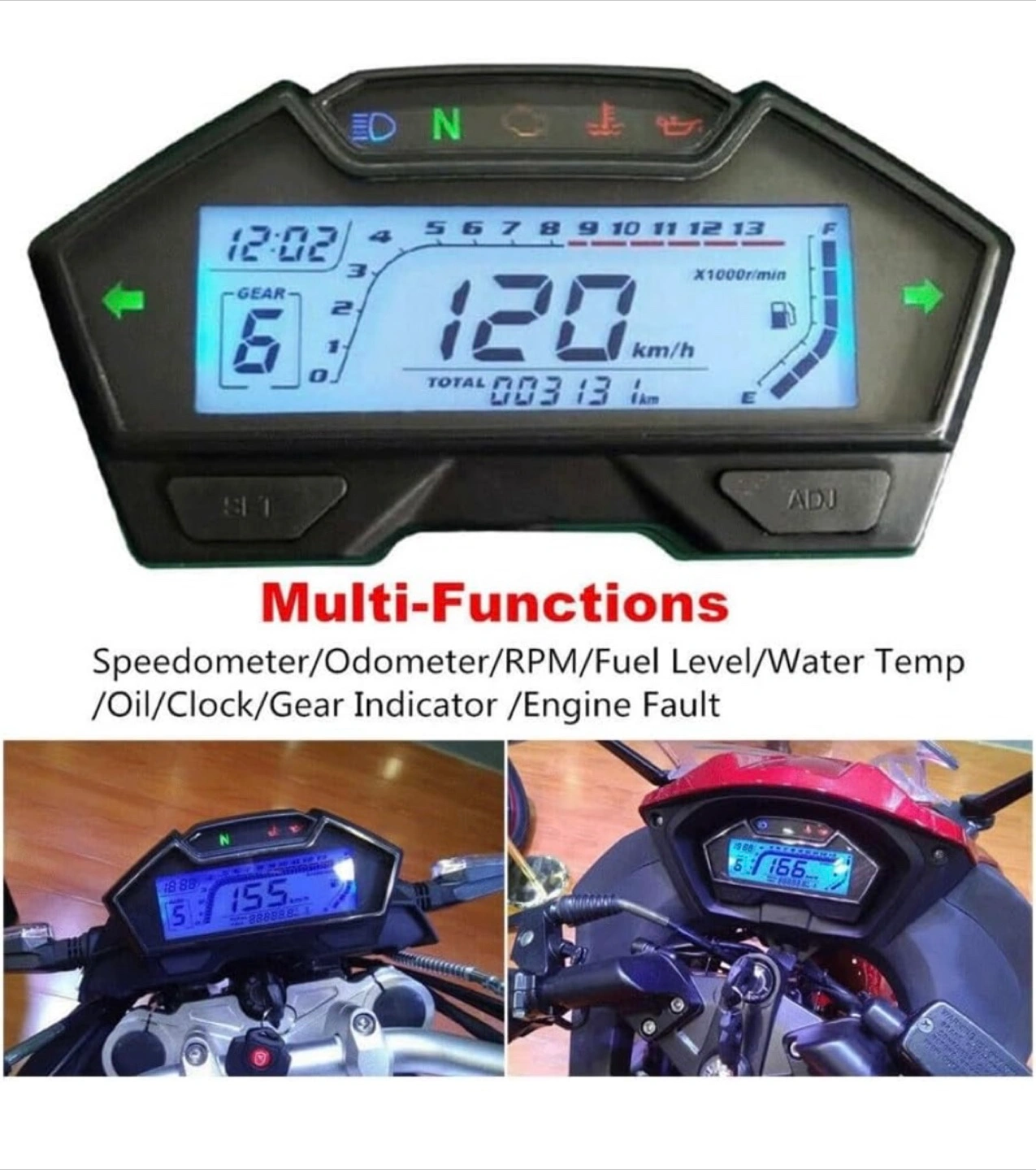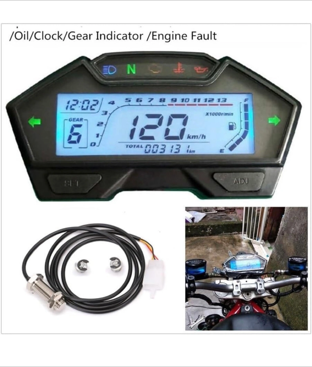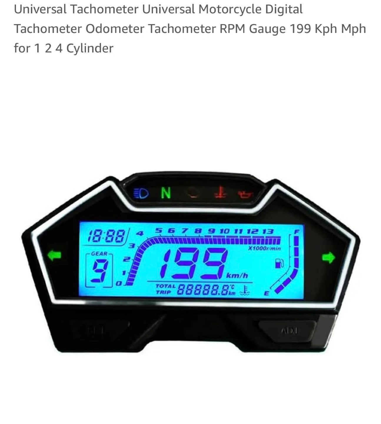 Selling a universal motorcycle digital tachometer. It functions as a speedometer, odometer, RPM gauge, fuel level, water temp, oil clock, gear indicator, and engine fault indicator