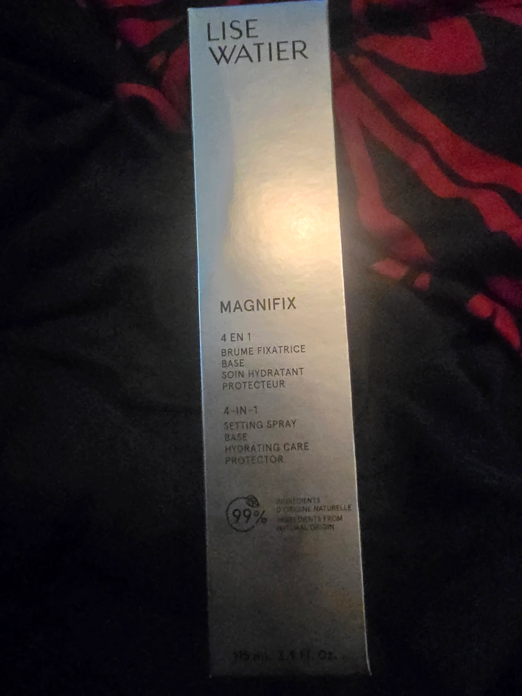 Selling a Lise Watier Magnifix 4-in-1 setting spray. It acts as a brume fixatrice base, soin hydratant protecteur, setting spray base, and hydrating care protector. It contains 99% ingredients from natural origin and comes in a 115 ml / 3.5 fl oz size