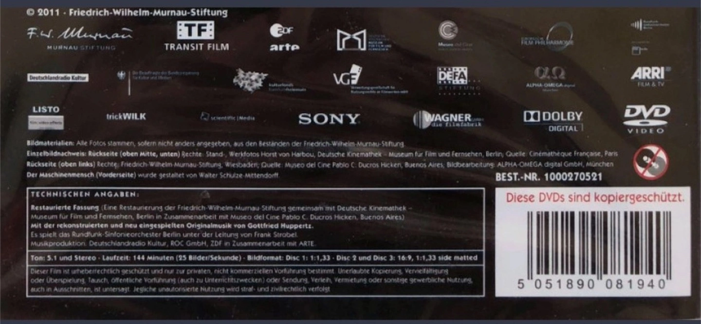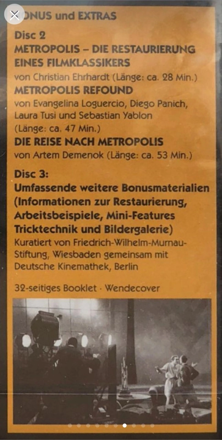 Metropolis - 3 Disc Special Edition DVD - OOP German Language - Brand New & Sealed! * Item available if you see this ad * • This German 3-Disc-Special-Edition by the Friedrich Wilhem Murnau Foundation is considered as the best and most complete version available of the Metropolis film including its extra material which is very rare and also an Out-Of-Print edition; as you may already have heard/read/searched • In 2001, the Metropolis film was inscribed on UNESCO's Memory of the World Register, the first film thus distinguished • In popular culture, Metropolis has been source of inspiration to a very wide selection of manga and popular artists around the world from Madonna, Janelle Monáe, Giorgio Moroder, David Bowie, Queen, St. Vincent and Lady Gaga to filmmakers such as Ridley Scott and George Lukas to name a few • The completed and restored version of Metropolis is an attractively designed 3-Disc-Special-Edition that will make a remarkable and unique addition to any movie collection • Metropolis is dubbed by some film-history experts around the world as the "Holy-Grail movie", and also, "a movie 1 century ahead of its time" Product Description Release: FSK 6 Version indicated: N/A Running time: 144: 03 min. (140: 36 min.) Regional Code: 2 DVD format: DVD-9 (8.5 GB) TV standard: PAL Packaging: Keep Case (Amaray) Image Format: 1.33: 1 (anamorphic / 16: 9) Audio format: Music / Instrumental (Dolby Digital 5.1) Music / Instrumental (Dolby Digital 2.0 Stereo) Subtitle: No (German Language) Runtime Bonus or Extras: 225 min. Extras: • 32-page Booklet • Reversible cover without FSK sticker DVD 1: • Feature film • Production data (13 text panels) DVD 2: • Metropolis - The Restoration of a Classic Movie (27:43 minutes) • Metropolis Refound (46:58 minutes) • The journey to Metropolis (52:26 minutes) DVD 3: • Working examples digital image restoration (14:22 minutes, partly with audio commentary) • Working examples reconstruction (35:49 minutes, partly with audio commentary) • Comparison subtitles German & Argentine version (10:14 minutes, partly with audio commentary) • Gottfired Huppertz as a small actor and extra in films by Fritz Lang (9:26 minutes) • Motives from Gottfried Huppertz 'composition for METROPOLIS in Willy Schmidt-Genter's music for CYANKALI (1930) (6:43 minutes) • Quotes from METROPOLIS in Geza by Bolvarys THE CASTLE IN FLANDERS (1936) (11:54 minutes) • Recording of a shellac record with key words from Lang and main motifs from the composition by Huppertz (8:39 minutes) • Mini features trick technique (only available on PC) • Picture galleries (57 pictures) Remarks: • The film runs at 25 frames / second. The original version of 1927 is now missing "only" about 8 minutes • The picture is actually encoded 16:9 anamorphic. On a 4:3 TV you have black bars on all 4 sides Note: The sound runs towards the end of the film 4-5 seconds asynchronous to the picture - too early. Listing pictures show the actual condition of this last-in-stock item. Where to meet? - CF Toronto Eaton Centre (Dundas St W & Yonge St) - Yorkdale Shopping Centre / Mall (Main Entrance Facing Dufferin St) * Any of those spots Thank you for looking!