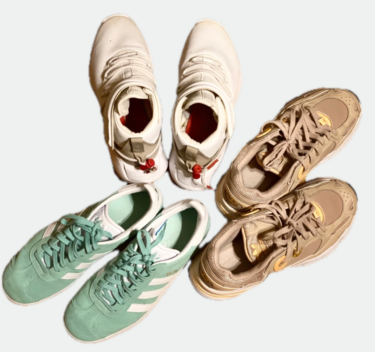 - Adidas Mint Green Gazelle Shoes (Size 6) - Reebok White Shoes (Size 6) - Adidas Beige Astir Sneakers (Size 6)
