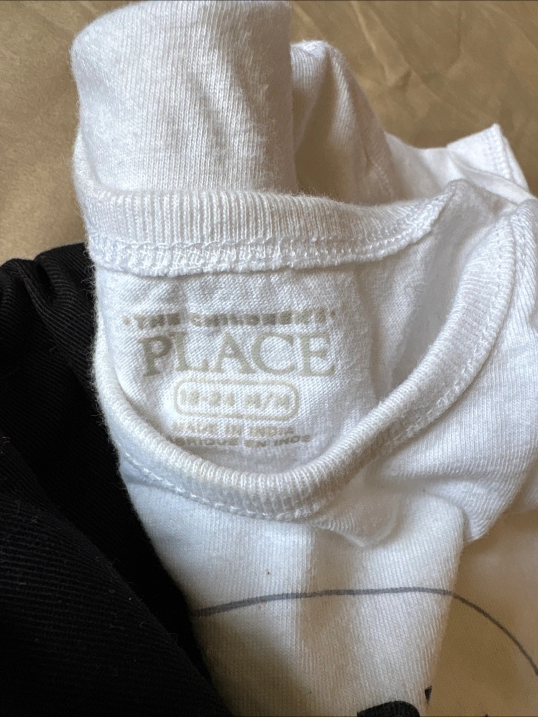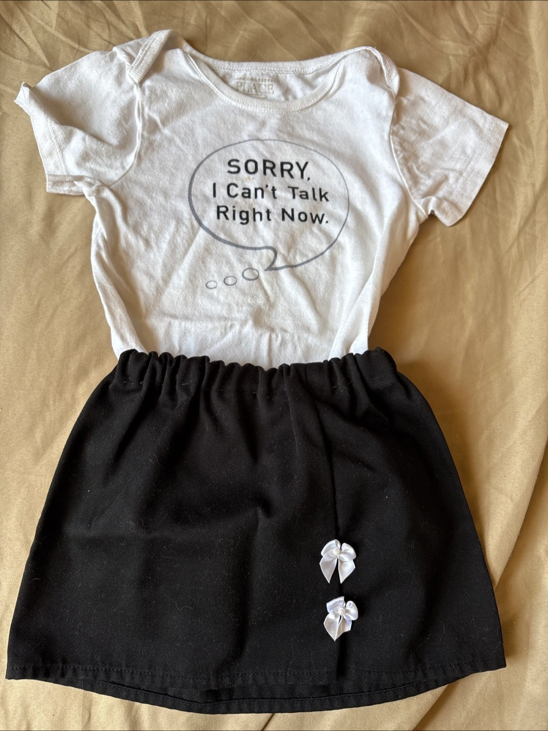 Cute outfit set from The Children's Place! Includes a white bodysuit with a graphic and a black skirt with little bows. Size is 18-24 months. There are some minor stains on the bodysuit, as shown in the photos. Only available for pick up.