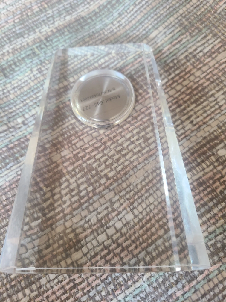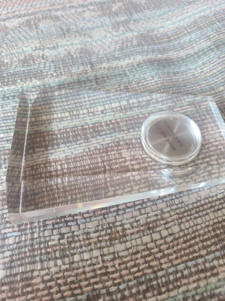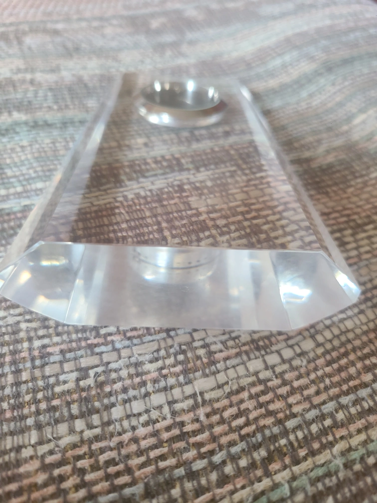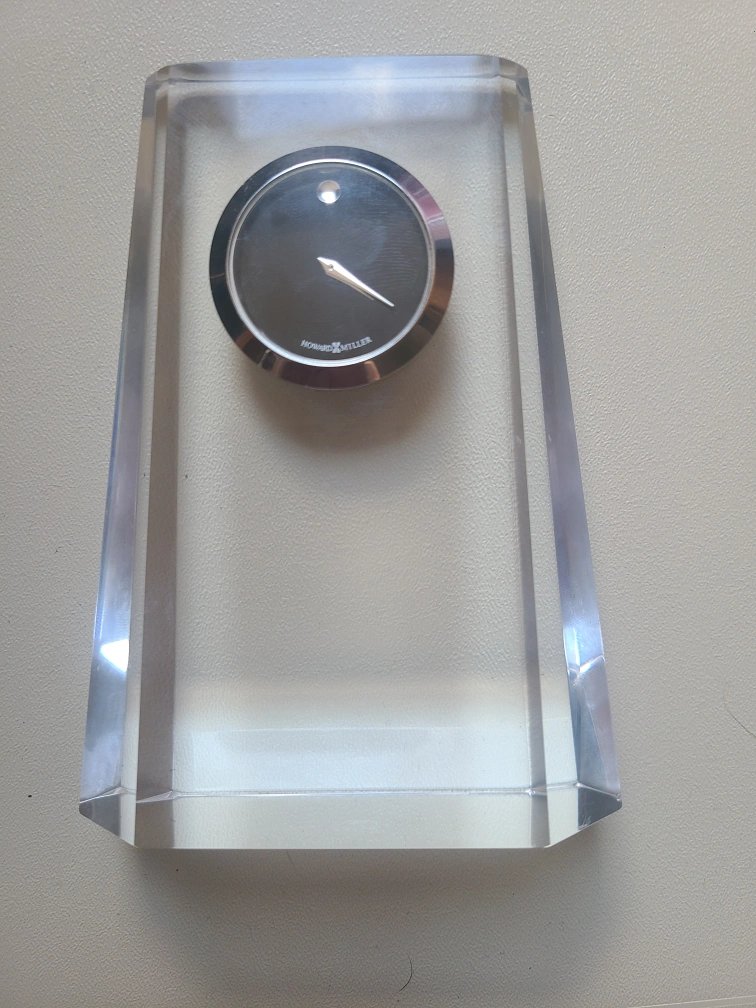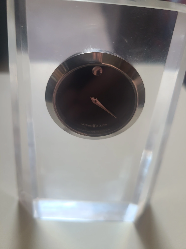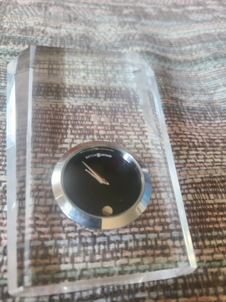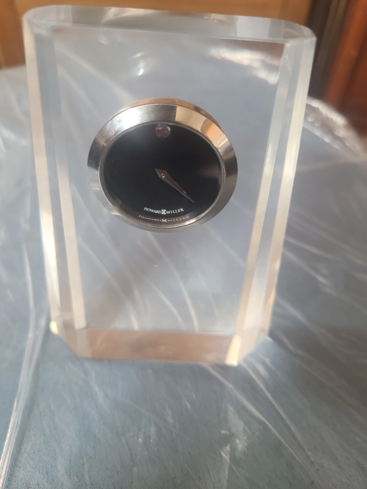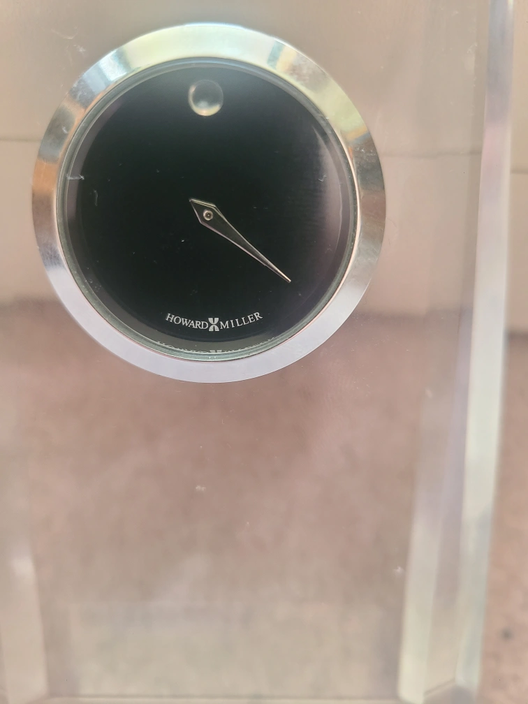 Selling a Howard Miller desk clock. It's a stylish piece with a clear acrylic design and a sleek black clock face. The model number is 645-727. Excellent condition, no scratches, cracks or dents.
