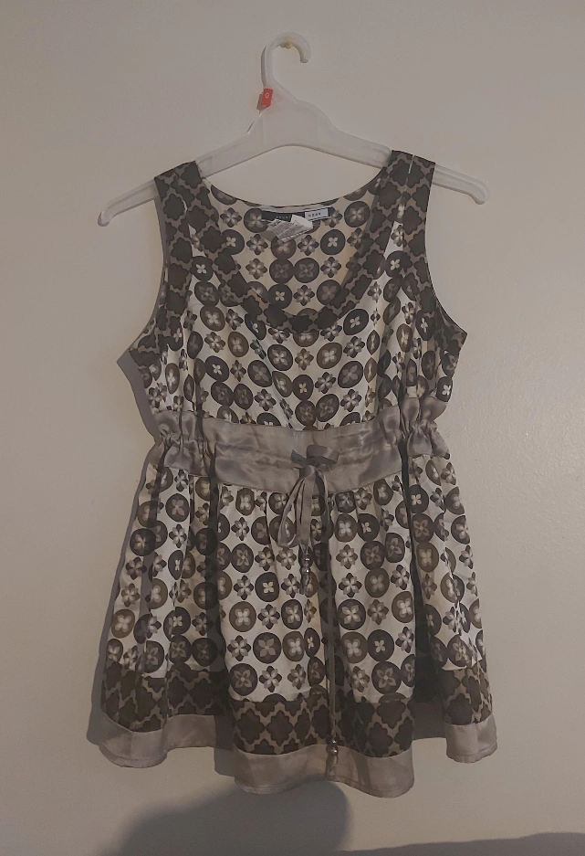 Brown and cream patterned sleeveless baby top. It has a drawstring waist and is a size 4. Material is silk-like.
