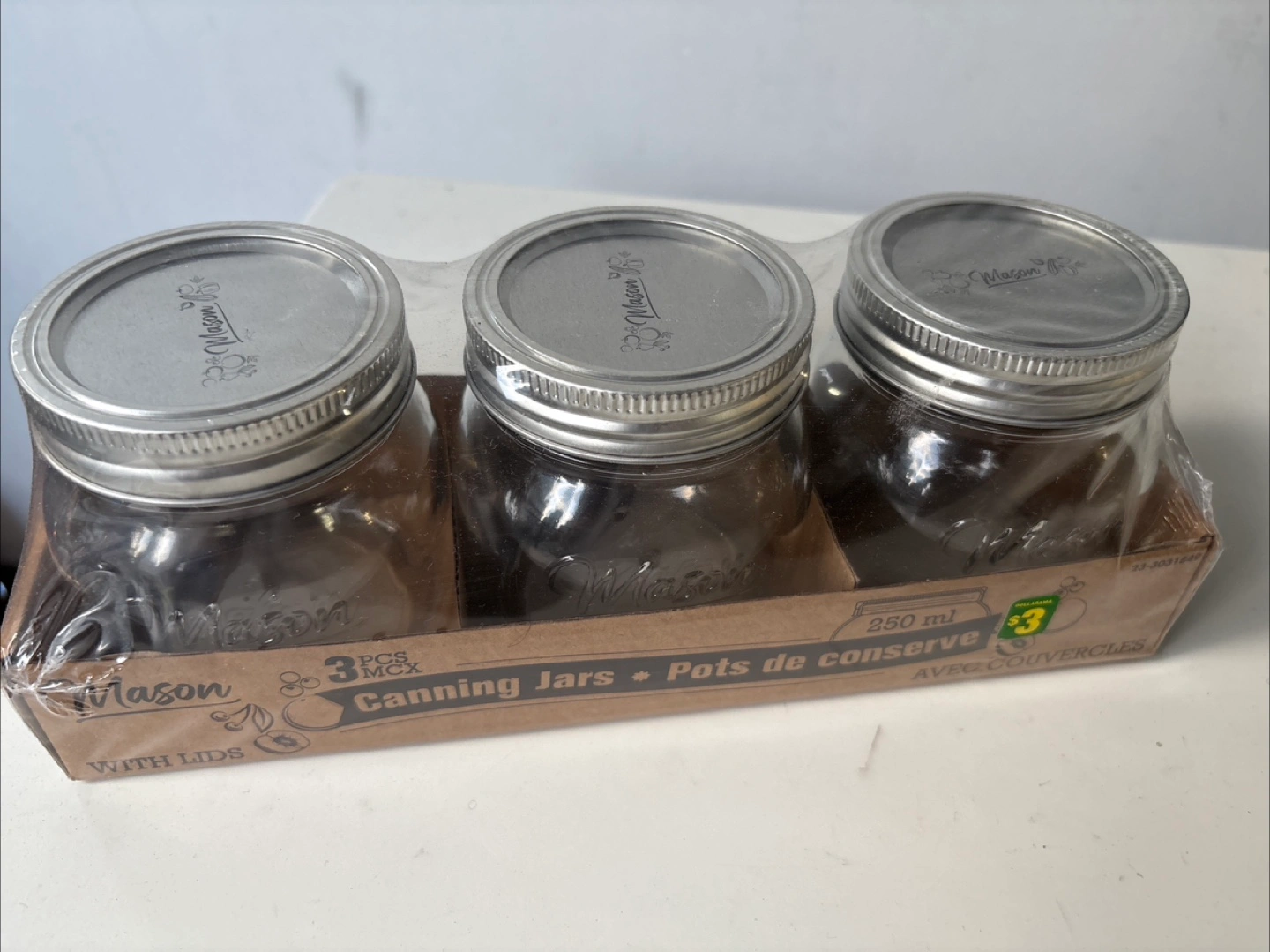 Giving away a brand new pack of Mason canning jars! This set includes three 250ml jars, perfect for all your canning needs. They come with lids and are ready to use. Pick up asap!