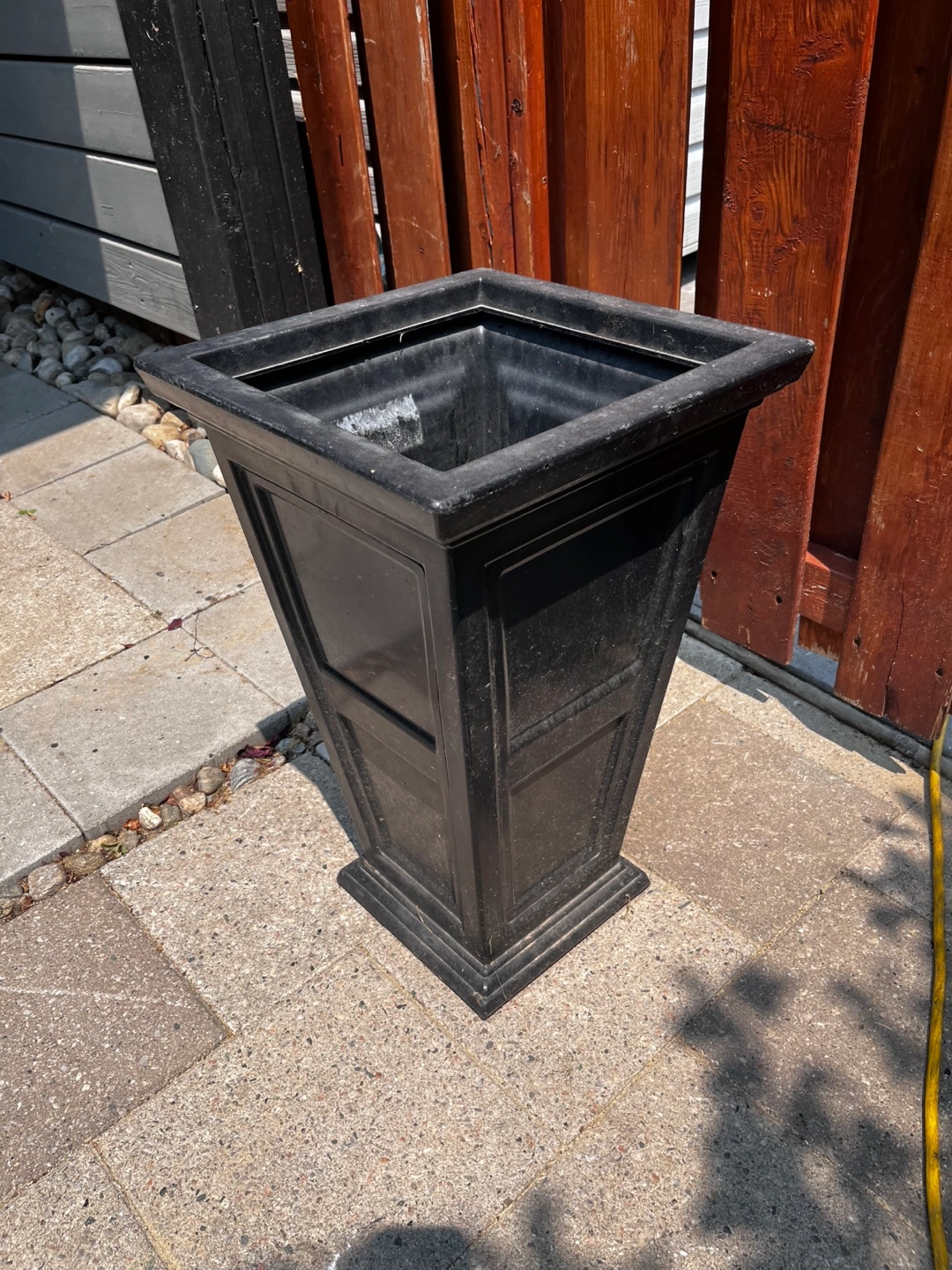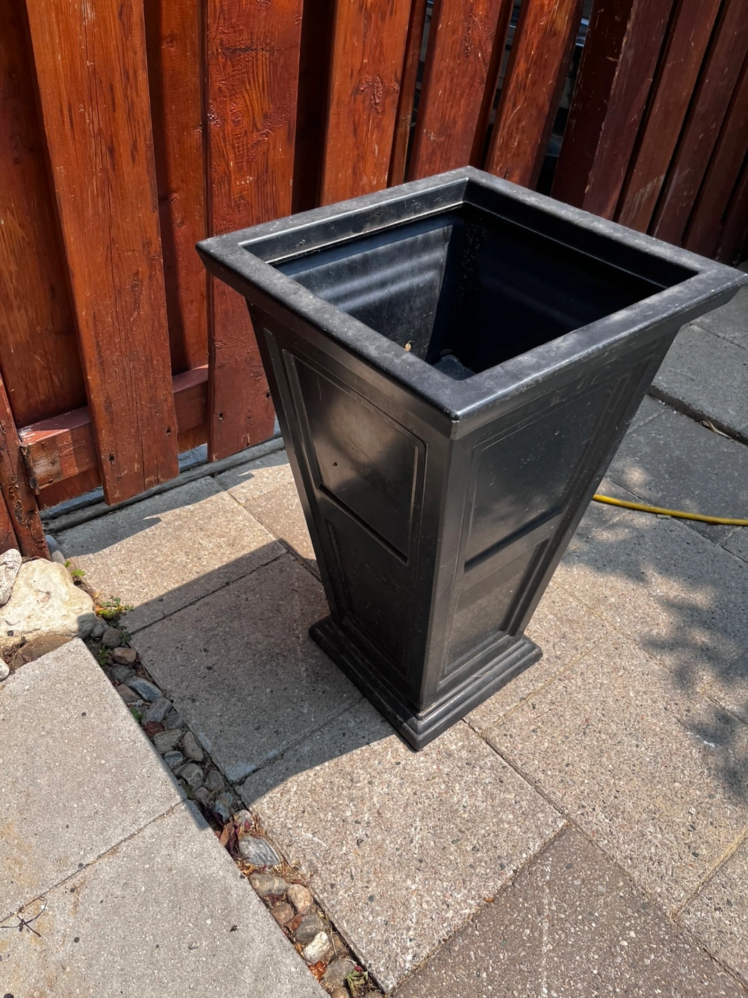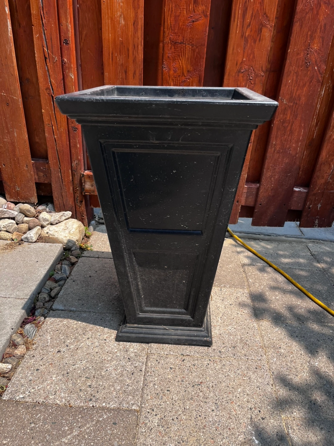 Selling a tall, square planter in black. It's in great shape and ready for your plants! Measures approximately 24”h x 15” W Pick up only. Closest intersection is Jane St and Eglinton Ave