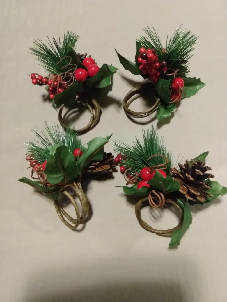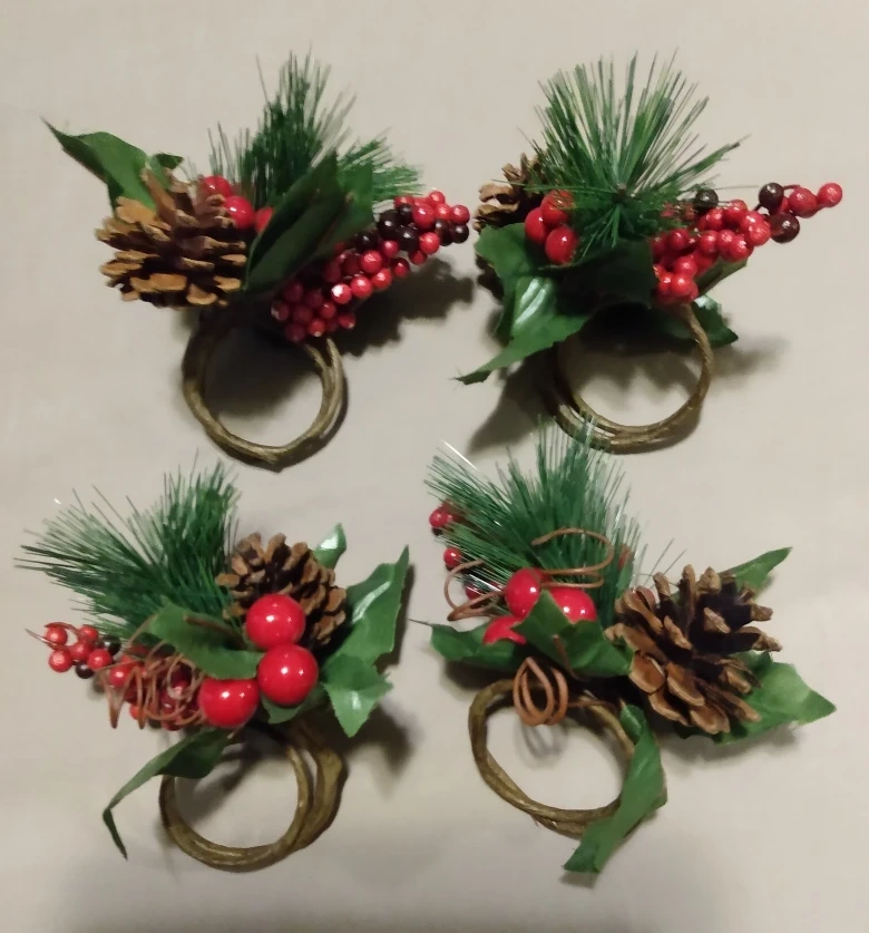 Spruce up your holiday table with these charming napkin rings! This set of four features a festive design with pinecones, berries, and greenery, perfect for adding a touch of seasonal cheer to your dining experience