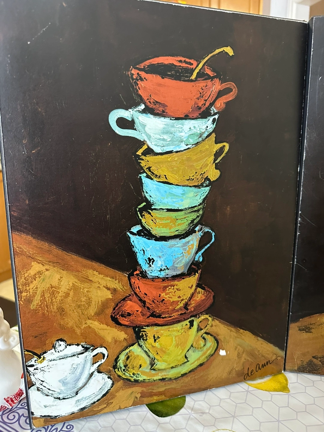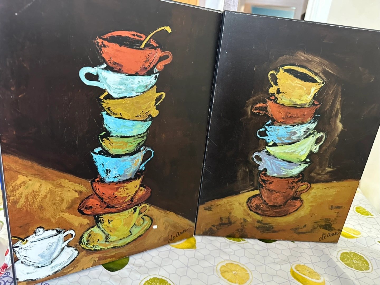 Selling a set of two vintage art prints featuring a stack of colourful cups. These unique pieces would add a charming touch to any room. In great condition!