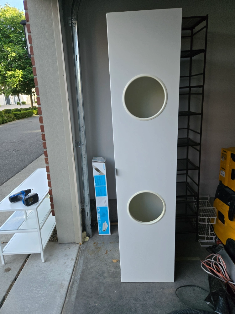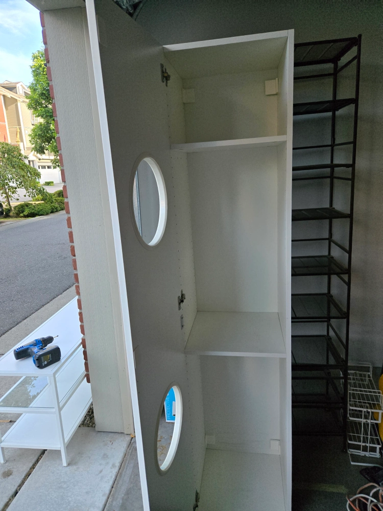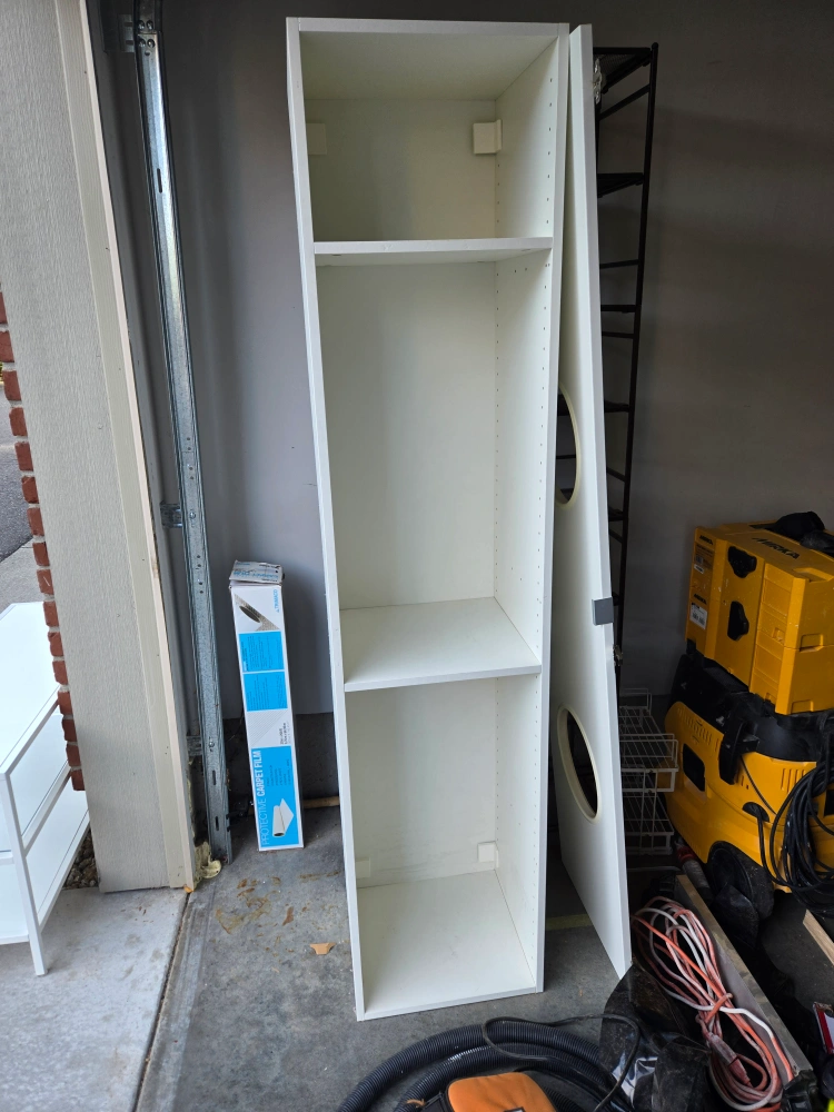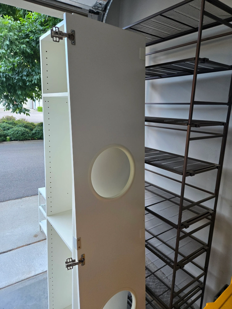 Selling an IKEA Stuva wardrobe in white. It's in great shape and ready to organize your space! Perfect for kids' rooms or any area needing extra storage. The door has two circular cutouts.
