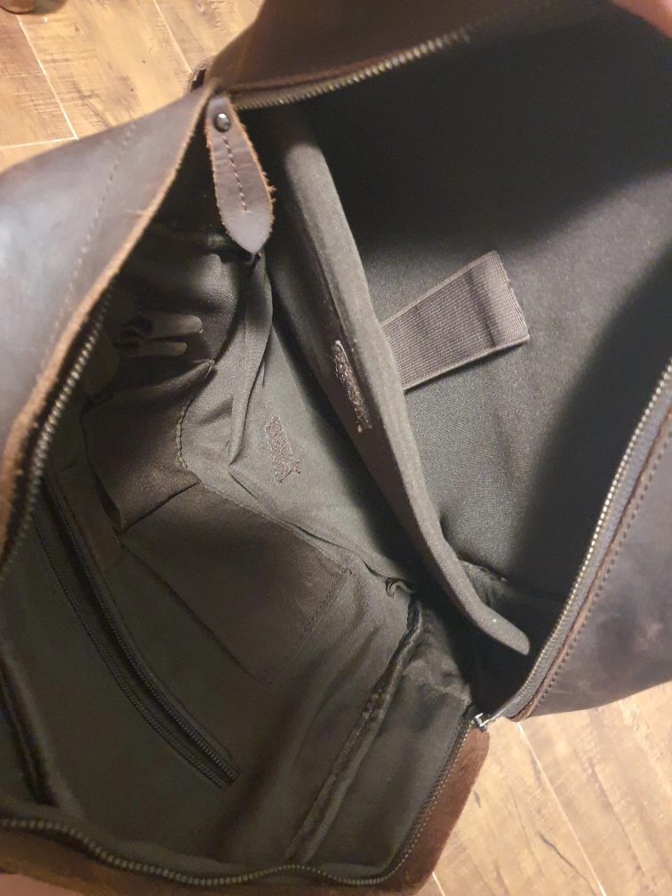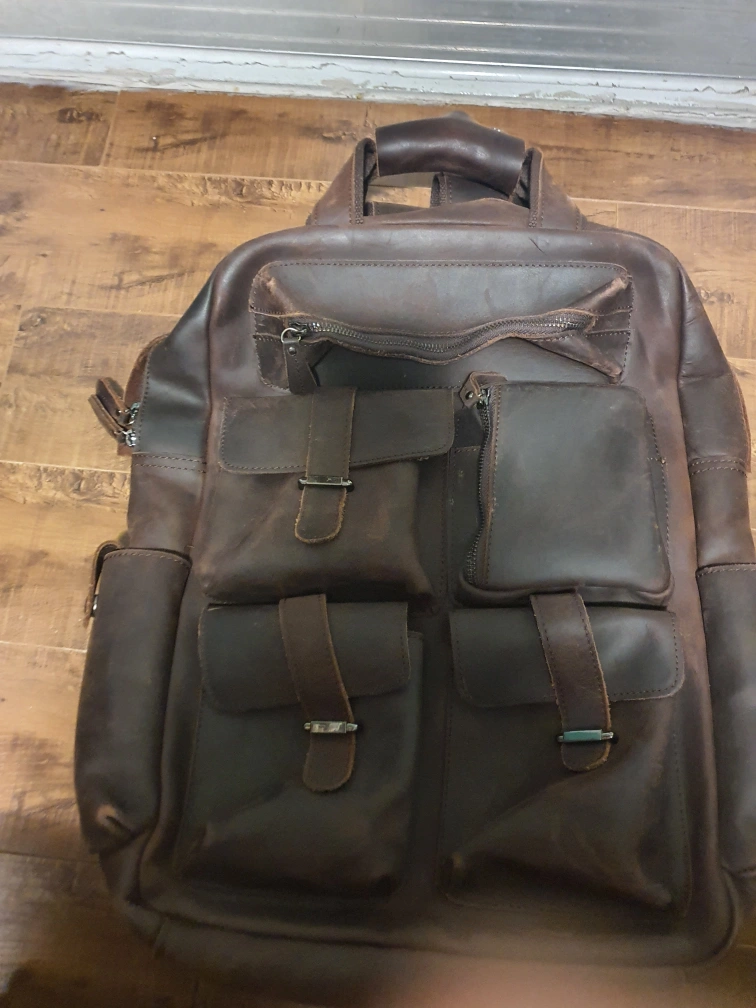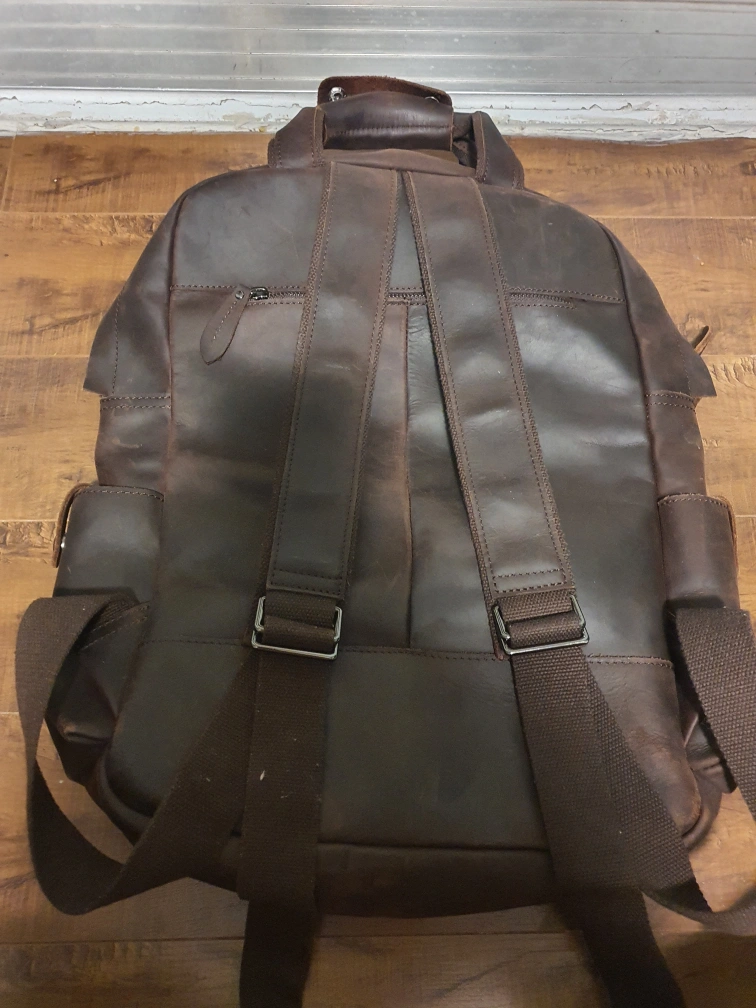 Selling a used leather backpack in brown. It has a lot of pockets and compartments for storage. It's perfect for school, work, or travel. The material is leather.