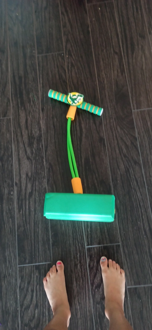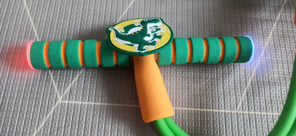 This fun dinosaur-themed pogo jumper is perfect for kids! It's green and orange, and features cute dinosaur designs. Great for active play and burning off energy.