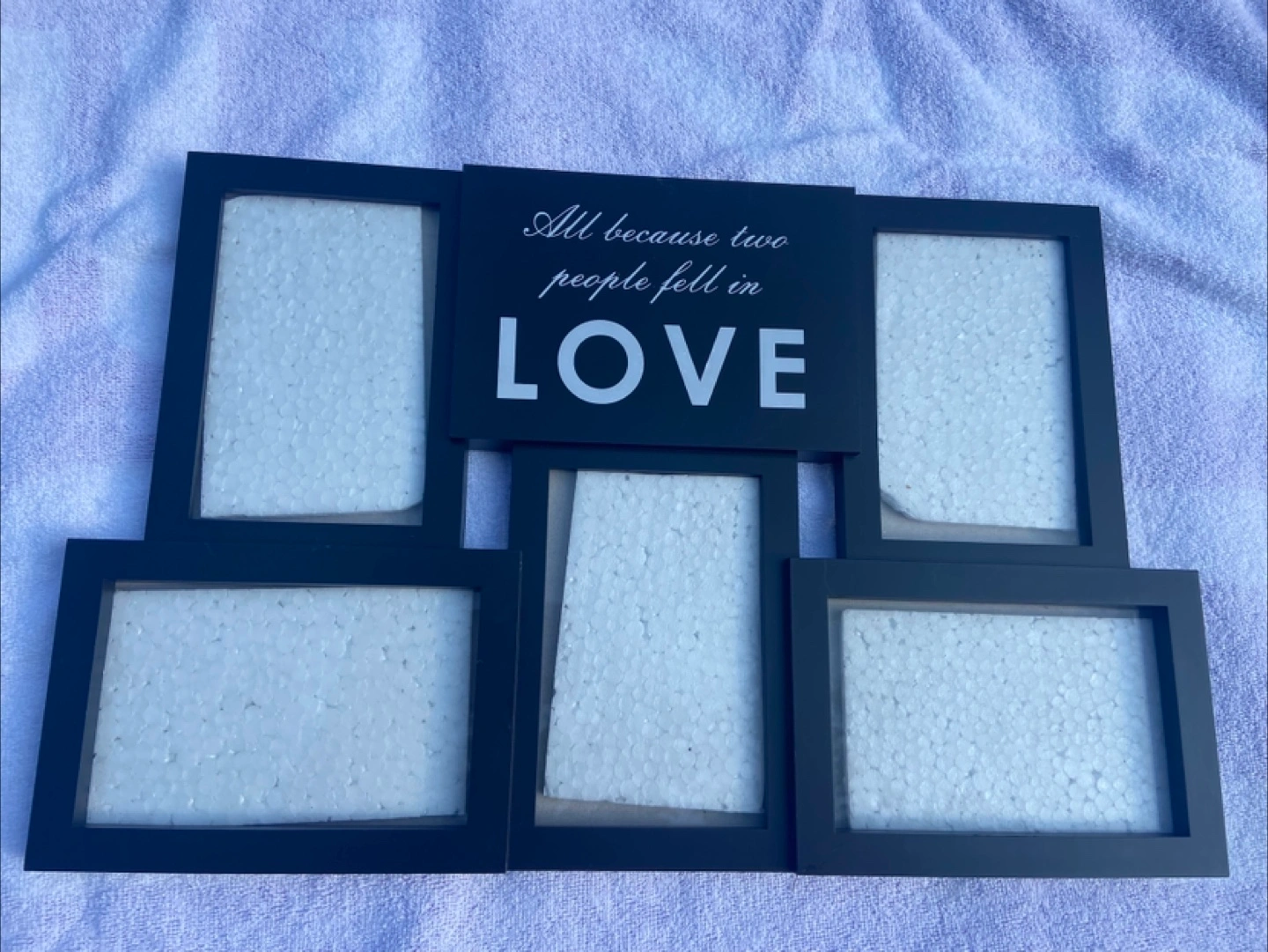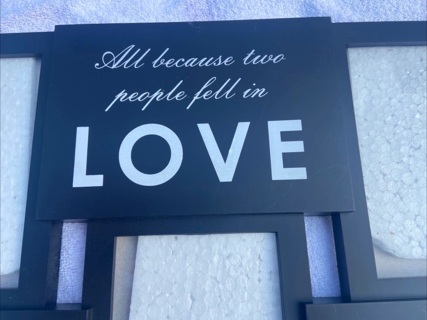 Add a touch of love to your home decor with this charming black multi-photo frame, designed to showcase cherished memories. This multi-photo frame is in good condition and ready to display your favourite photos. It features a stylish design with the words "All because two people fell in LOVE". I can tell you it looks great. Cash Payment Only & Pick up Only No Refunds / Exchange No try ons, No trading, No holds. All purchases are Finally Sale From a Smoke Free home Fast pick up Confirmed Price-$2 Cash only Pick u only Pick up- Only at intersection Mortimer ave and Coxwell ave Located In East York, Toronto If you're reading this, it's still available!