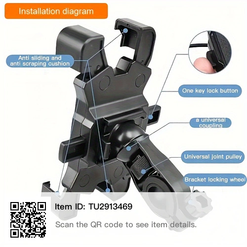 Secure your phone on any bike, motorcycle, or scooter with this universal phone mount! It features 360° rotation for optimal viewing and an anti-sliding, anti-scratching cushion to protect your device. The one-key lock button and universal joint pulley make it easy to use and adjust