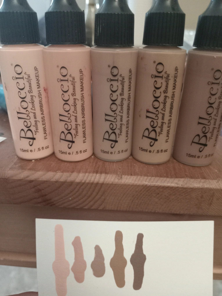 Bellagio 5 Flawless airbrush makeup set each bottle contains 15 mL of product, the colors are Blanc, Alabaster, mocha, cocoa, and honey beige. all five colors can be mixed and matched for the perfect color combinatio. Purchased for over $150.