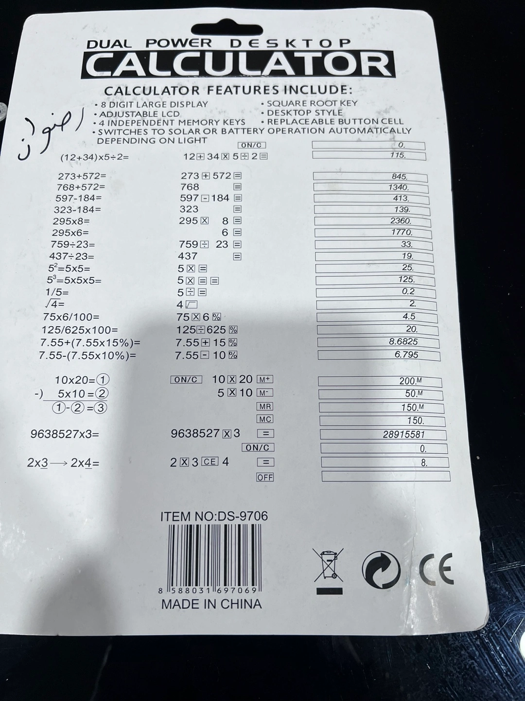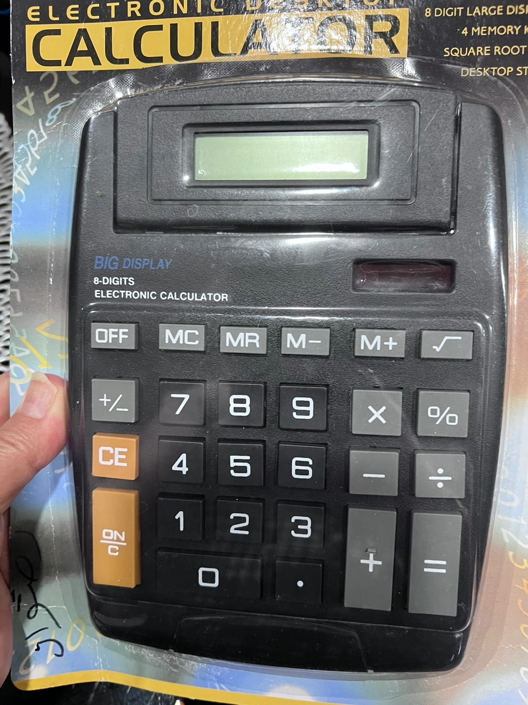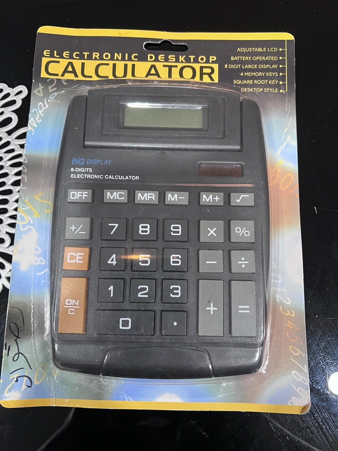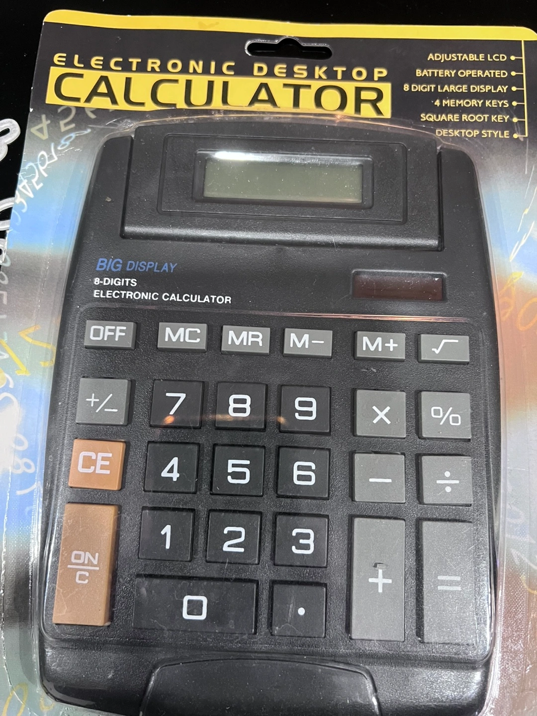 Selling a brand new, still-in-package electronic desktop calculator! It features a big display with 8-digits, adjustable LCD, 4 memory keys, square root key, and a desktop style. It's battery operated and has a replaceable button cell. Item number is DS-9706