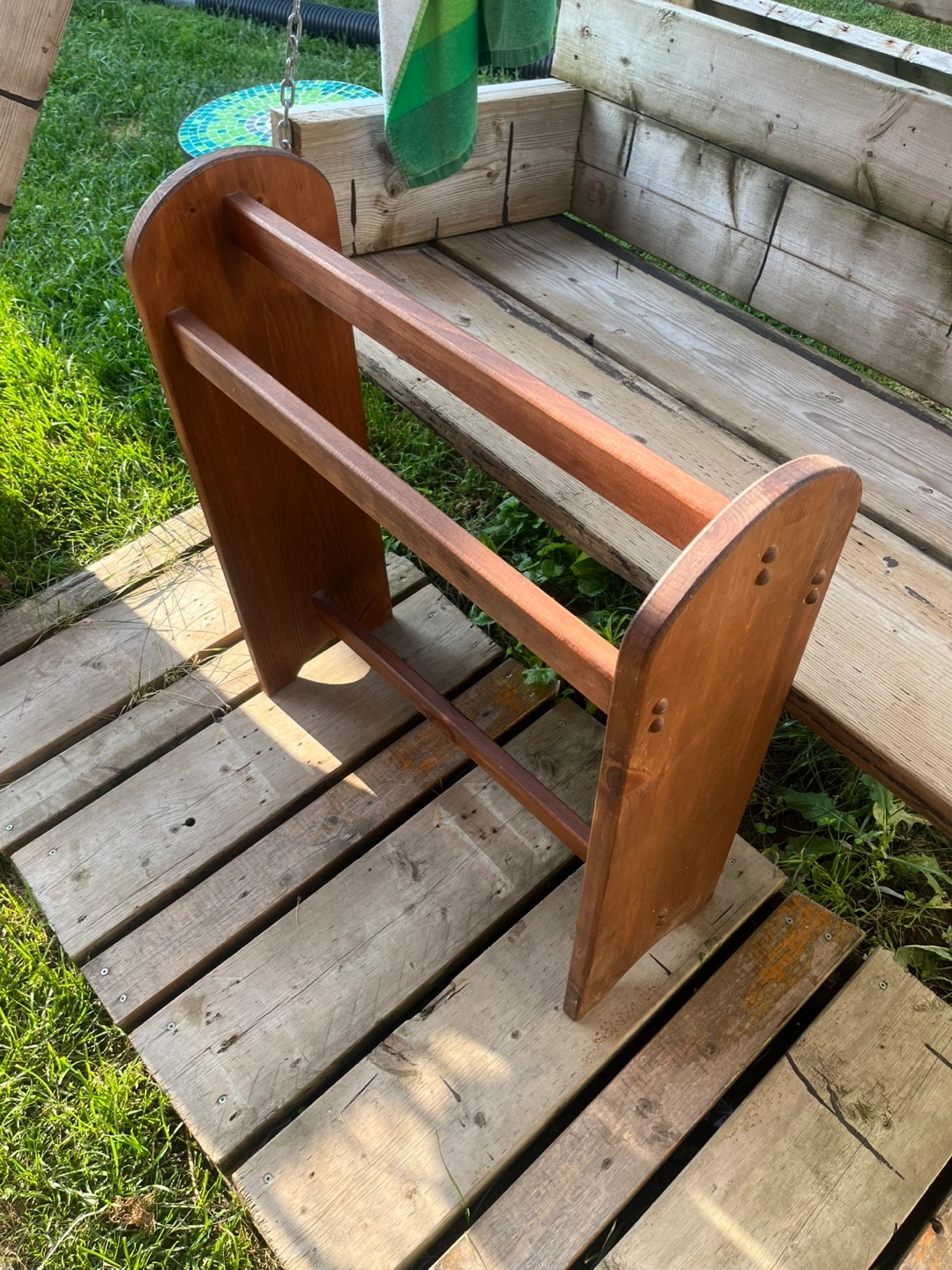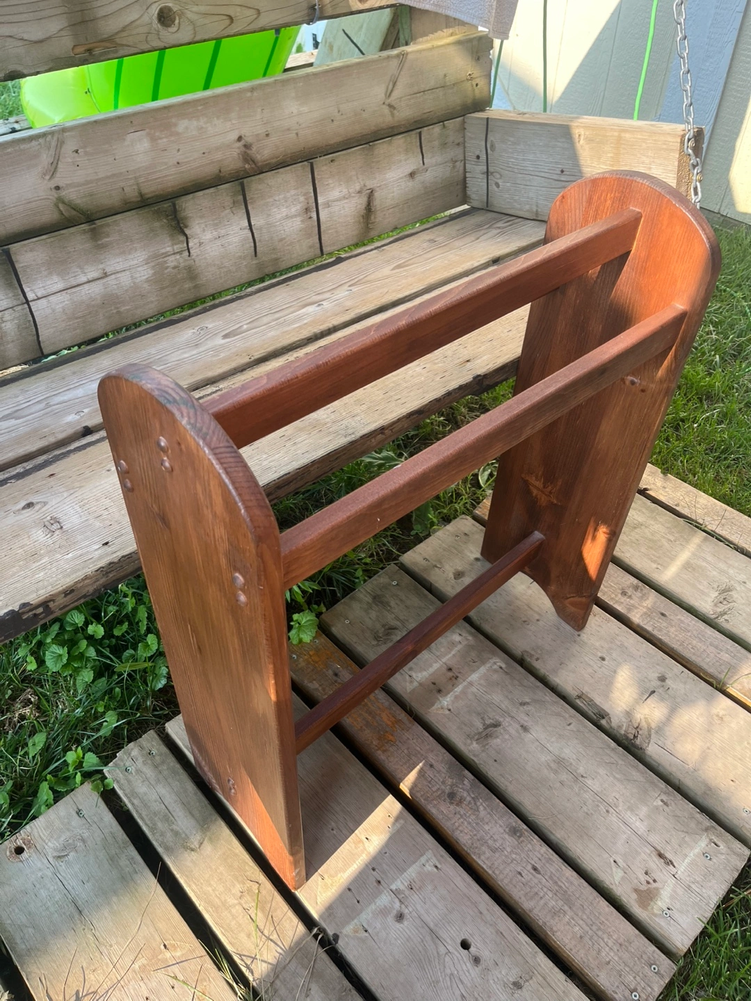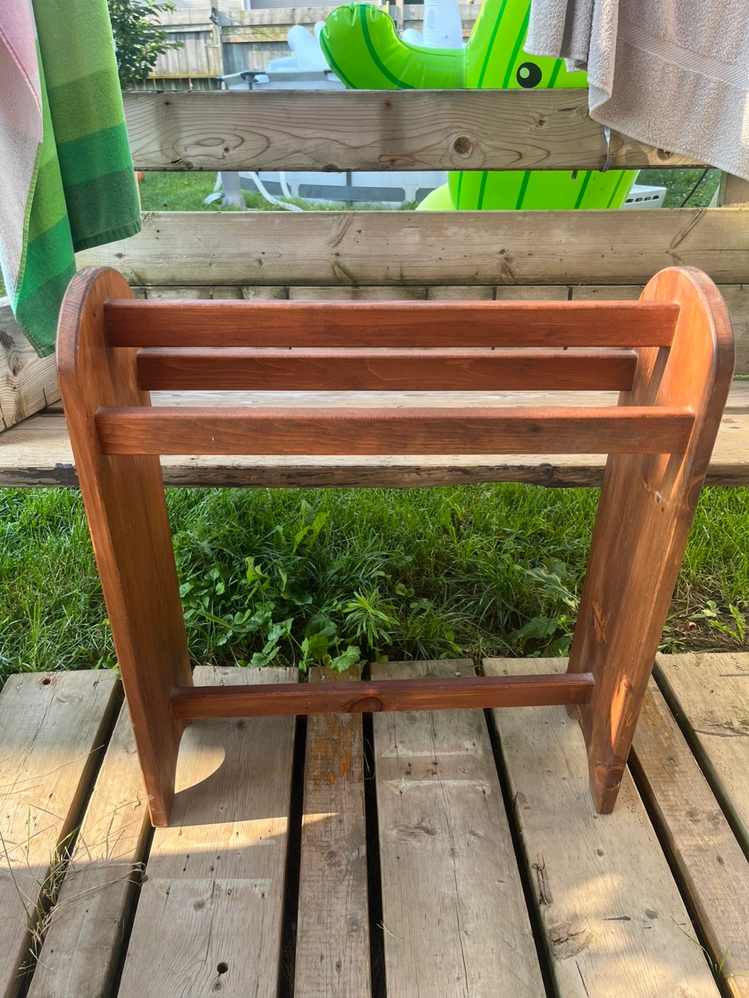 Selling a wooden towel rack. It's a great way to organize your towels in the bathroom or by the pool. It's in good condition and ready for a new home!