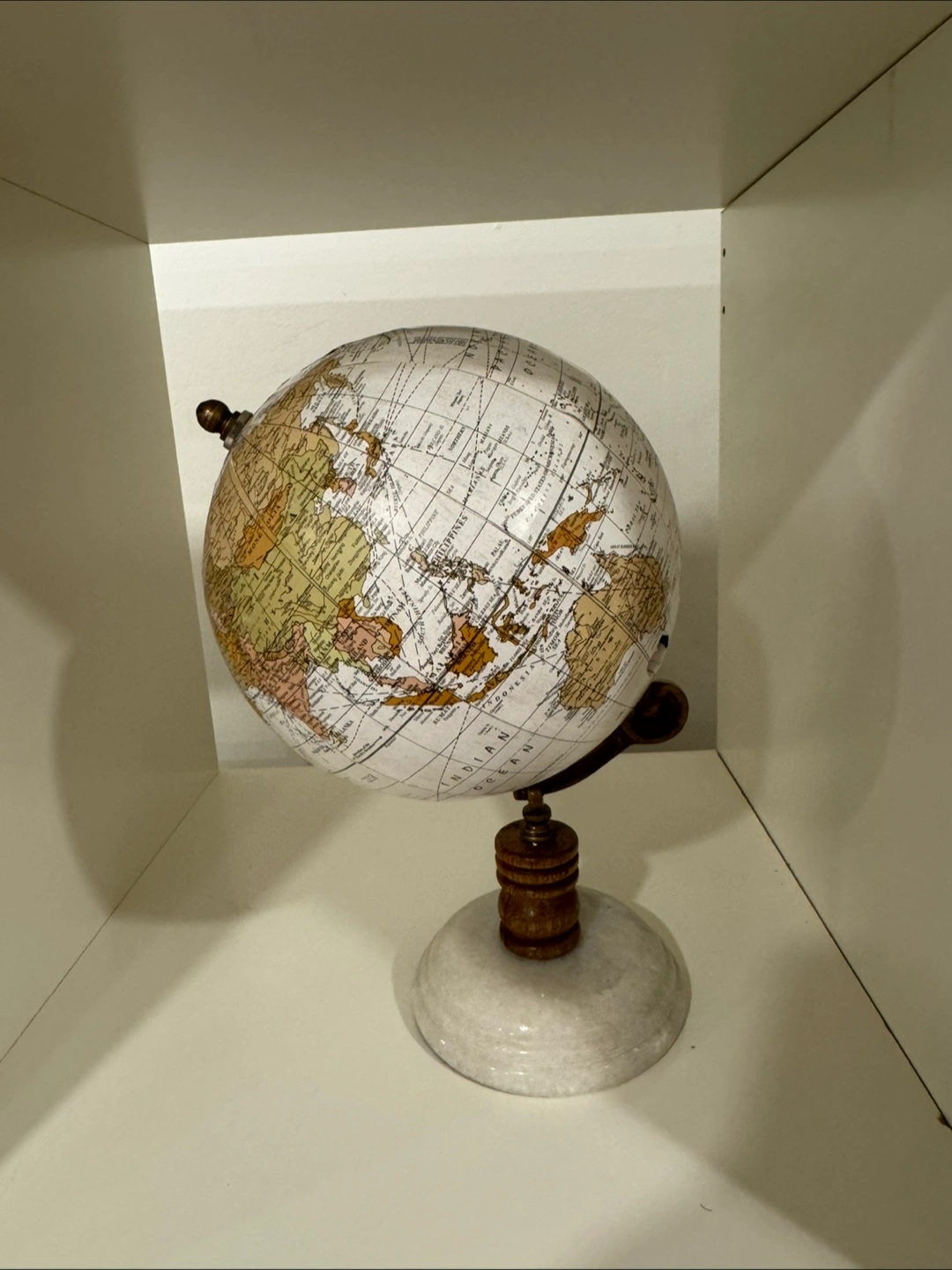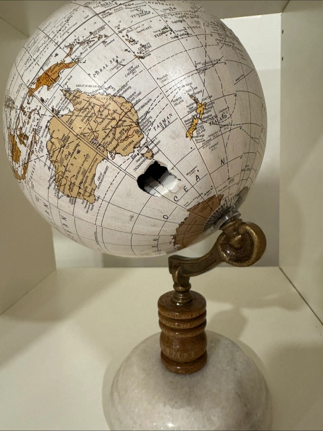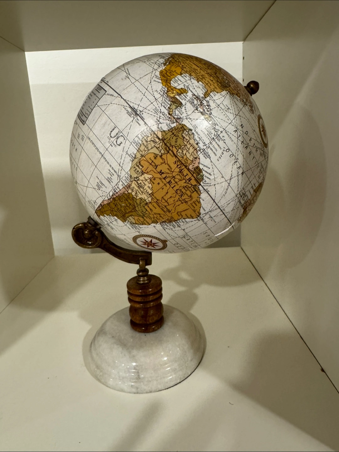 Selling a decorative world globe! It has a marble base and a wooden stand. There is a little damage to the globe, but it’s still perfect to decorate. It is a really good quality, heavy and nice.