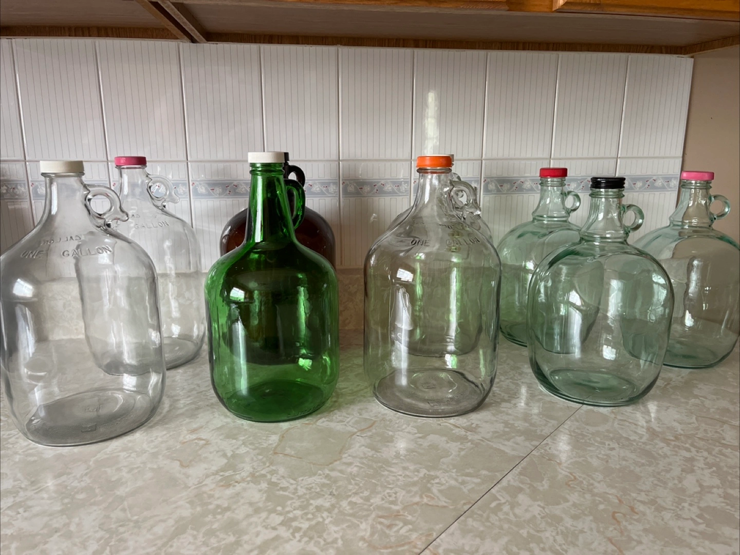 Selling these one-gallon glass jugs! 9 in total They're great for brewing, fermenting, or just adding a rustic touch to your decor. I have several available, in clear and green/brown glass. $5 each