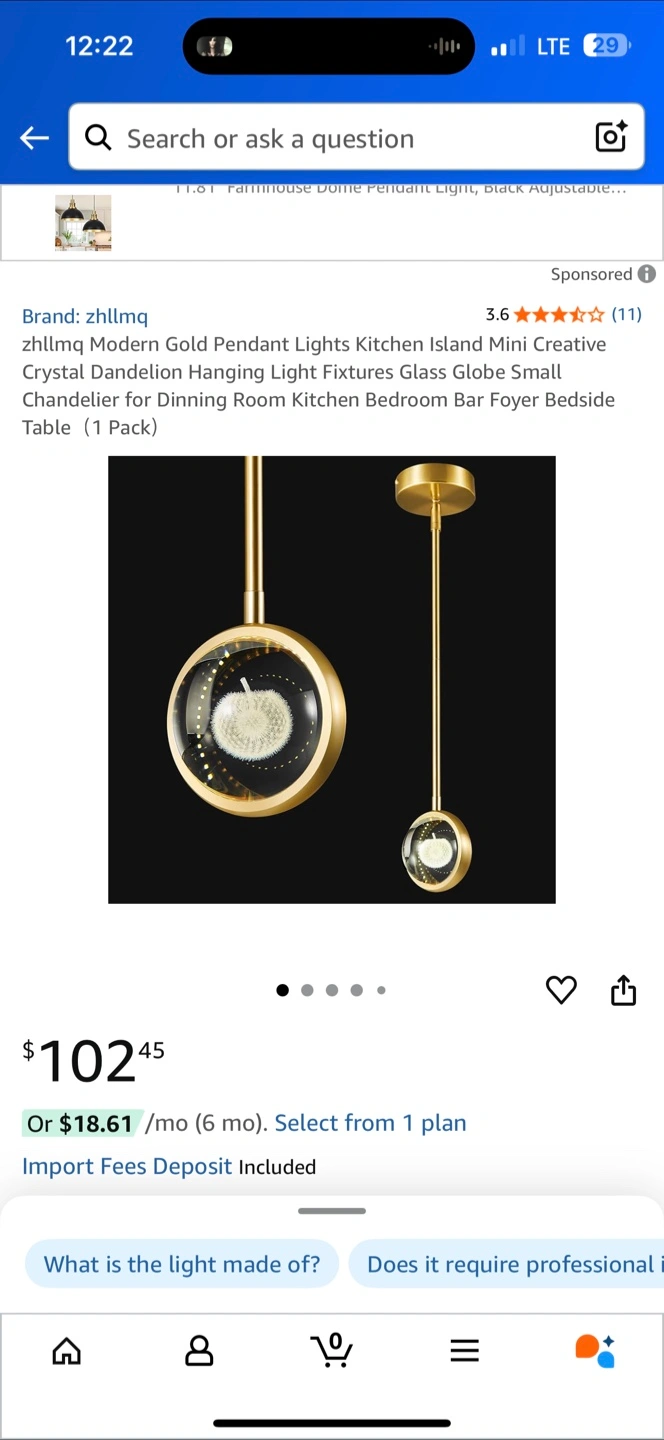 Add a touch of modern elegance to your space with this beautiful gold pendant light! The light features a crystal dandelion design within a glass globe. The metal ceiling plate and aluminum construction ensure durability. The product size is 4.72in x 3.94in x 43.31in. It originally sold for $102.45
