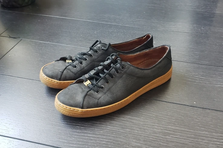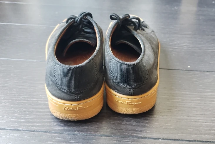 GUC, well-loved Ferragamo Sport sneakers. Blue suede exterior and natural rubber gum sole. Gold logo stamped hardware piece at lace's end. Size 6.5. I am a 7 and wore them but they slightly tight but definitely wearable.