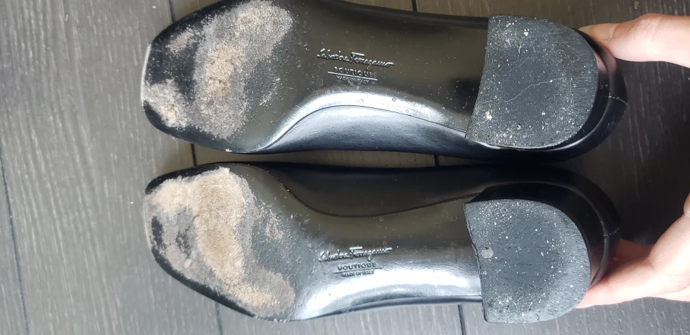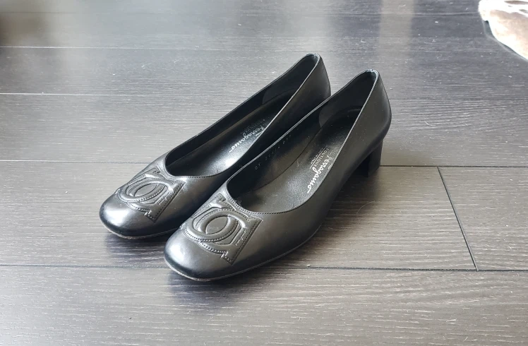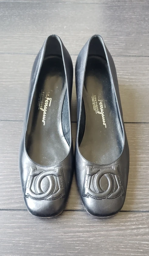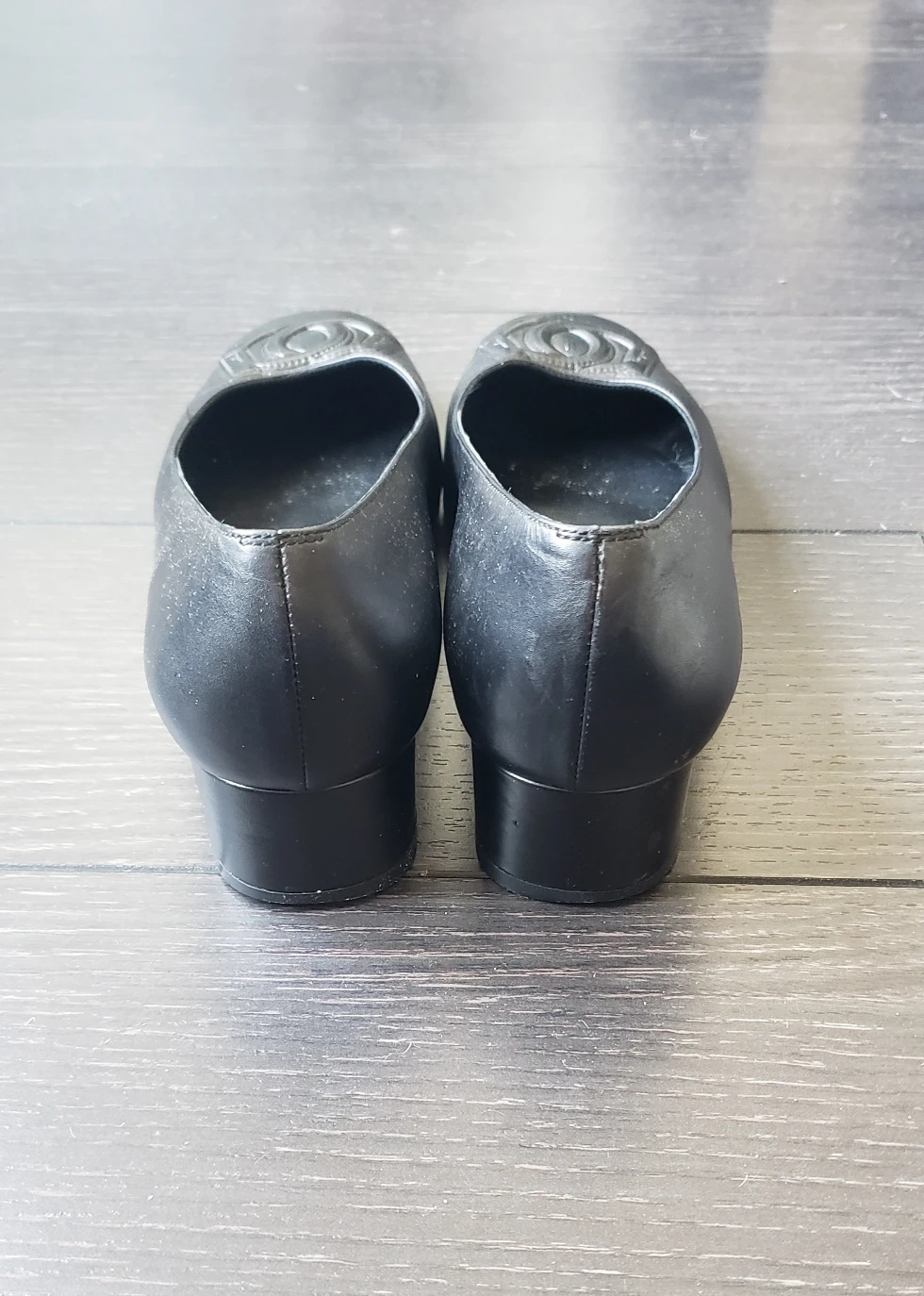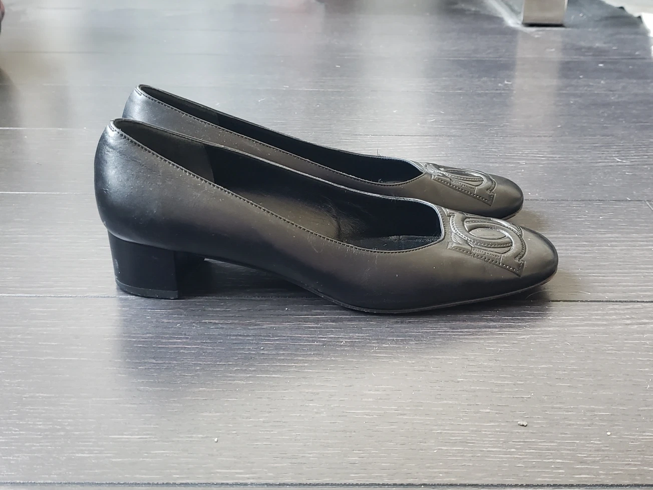 Ferragamo Black Leather Low Pumps w/ Interlocking Gancini Emblem